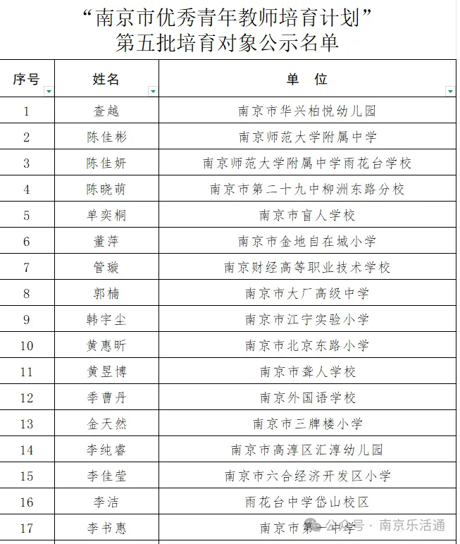 根据《关于开展“南京市优秀青年教师培育计划”第五批培育对象推荐工作的通知》(宁教函〔2025〕55号)要求,经有关工作程序产生43位入选人员,现将第五批培育对象入选人员名单予以公示(名单附后)。公示期为2026年1月5日至1月9日。