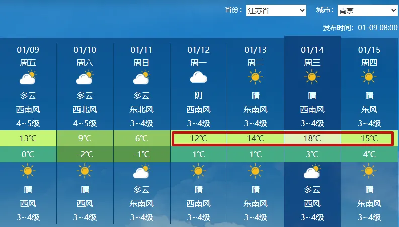 南京市气象台今天10时发布全市天气预报全市今天下午到夜里多云到晴西南风4到5级阵风6级今天最高气温12℃到13℃明晨最低气温2℃到3℃1月10日全市多云到晴西北风4到5级阵风6级1月10日最高气温9℃左右1月11日最低气温-1℃到-2℃,有薄冰1月11日全市晴转多云偏北风转东南风,风力3到4级1月11日最高气温6℃到7℃1月12日最低气温-1℃到-2℃,有薄冰
