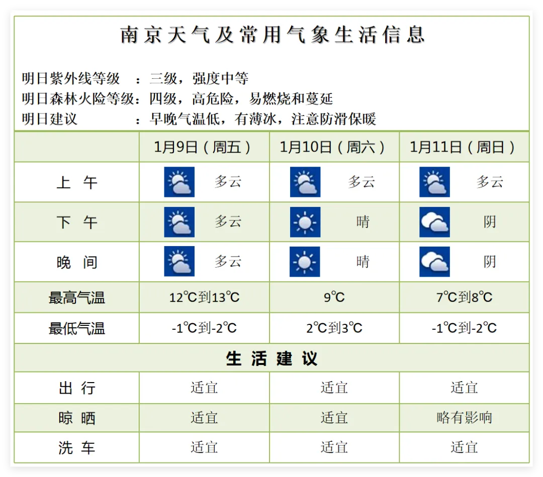 1月10日多云到晴,西北风4到5级阵风6级,最低气温:2℃到3℃,最高气温:9℃左右;