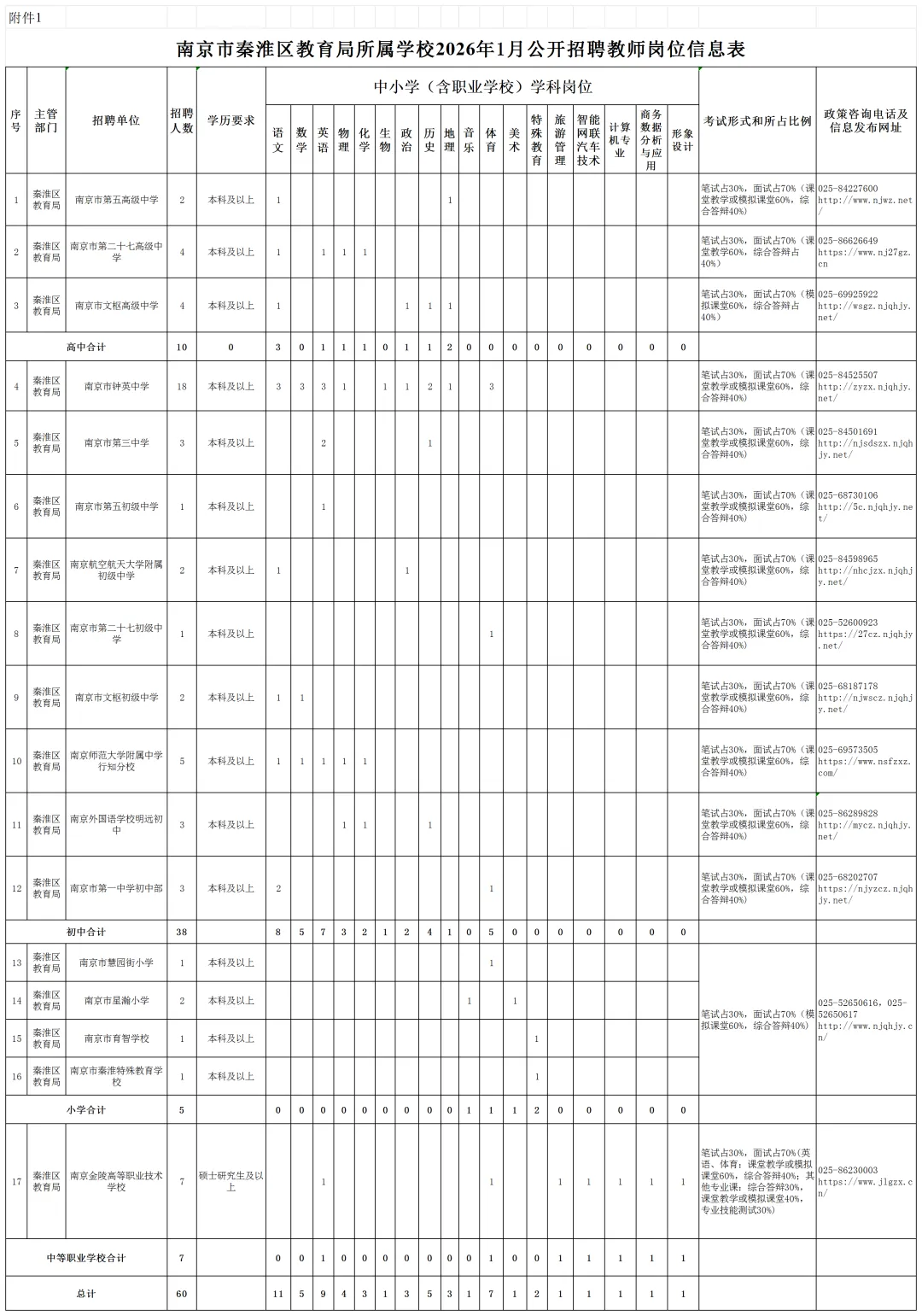 本次招聘相关信息在秦淮区人民政府网(http://www.njqh.gov.cn)、秦淮教育信息网(http://www.njqhjy.cn)和南京市教育局网(http://edu.nanjing.gov.cn)公开发布。具体的招聘单位、招聘岗位及招聘条件等详见《南京市秦淮区教育局所属学校2026年1月公开招聘教师岗位信息表》(附件1,以下简称《岗位信息表》)。