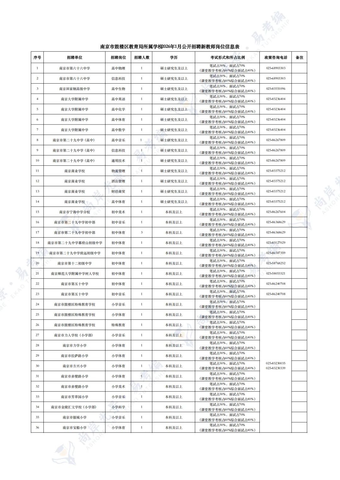 1、南京市鼓楼区教育局所属学校2026年1月公开招聘新教师岗位信息表