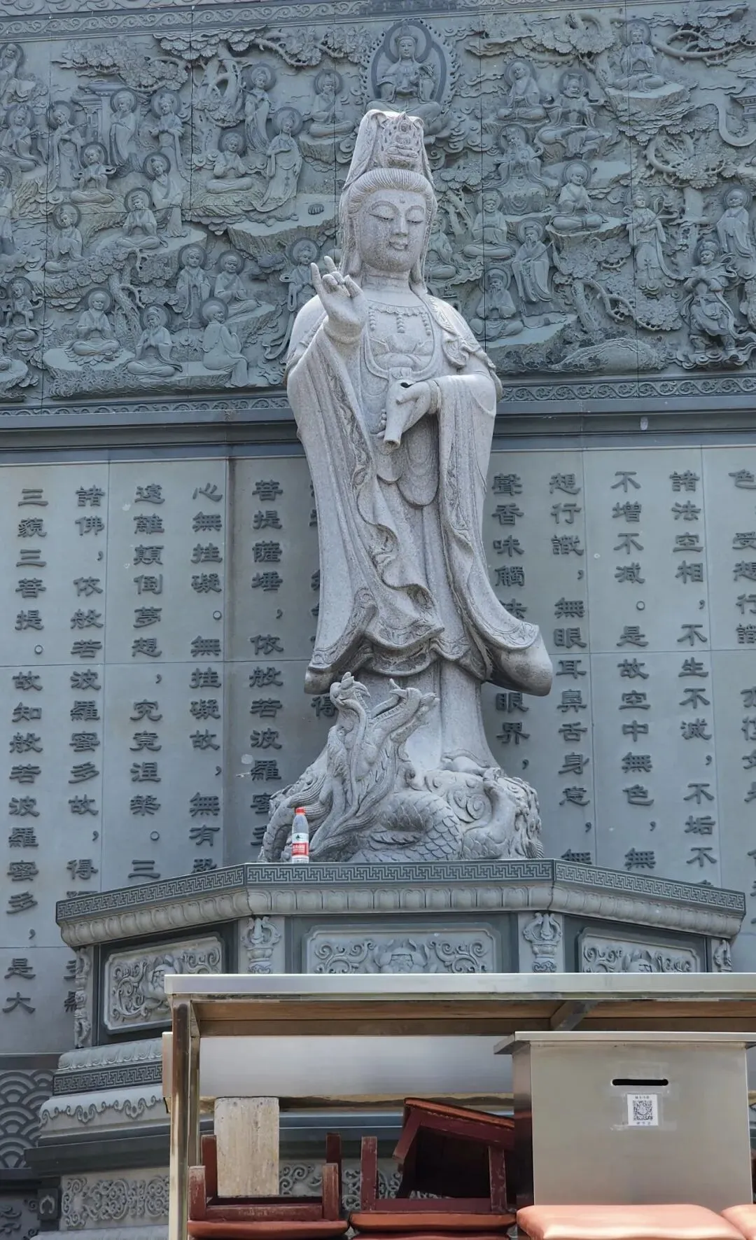 园通宝殿是大士岩寺的核心建筑,殿内供奉着镇寺之宝——玉带观音像。这尊天然巨石雕刻的观音像高约3米,头戴宝冠,身披璎珞,左臂抱婴,右手持柳枝,法相庄严,神态慈祥,是典型的送子观音造型。腰间的天然白纹玉带更是神来之笔,为观音像增添了几分灵动与神圣,信众皆称其"有求必应",尤其在求子方面格外灵验。