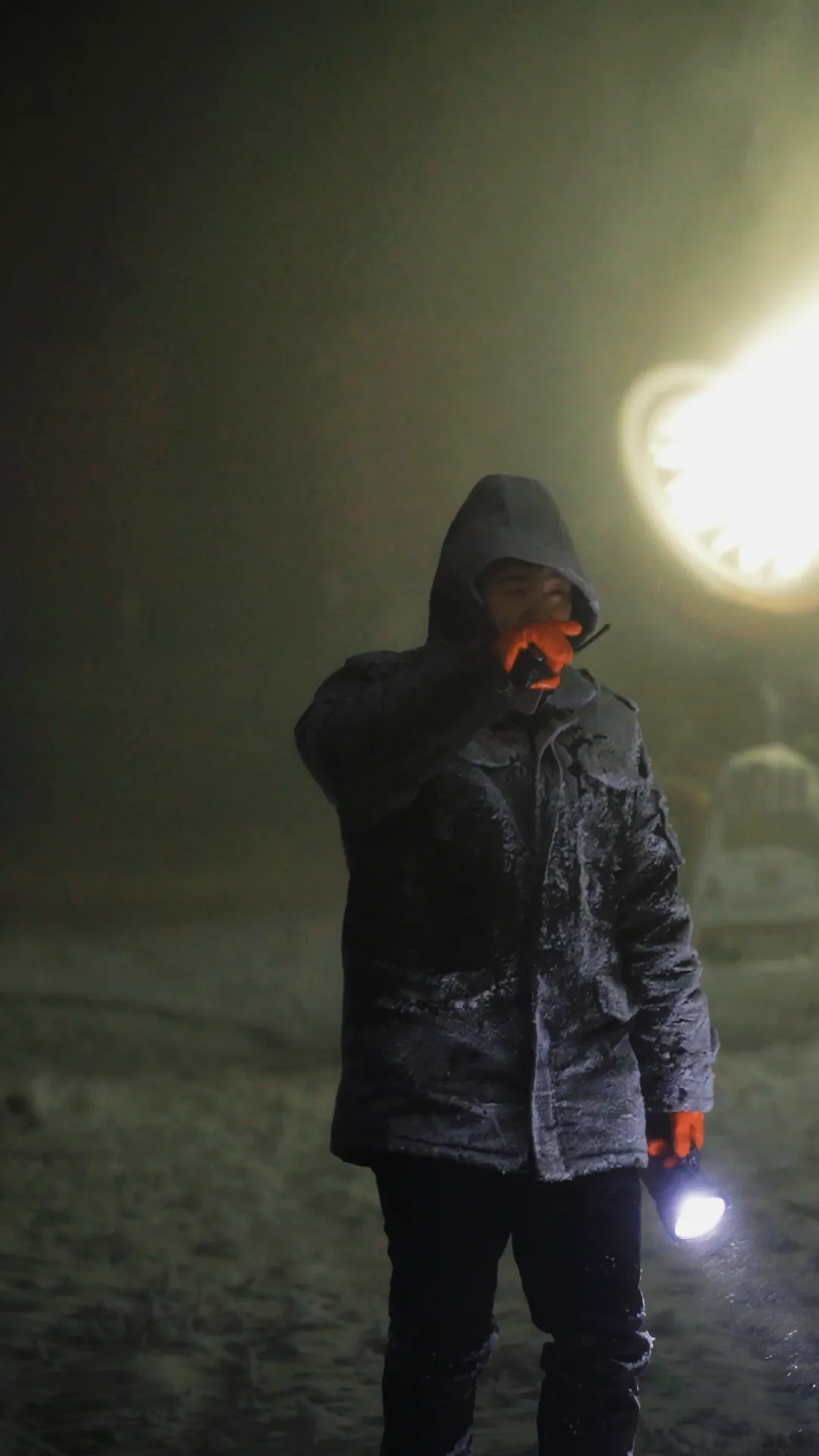 细密的雪雾在灯光下旋转、翻涌、飘落