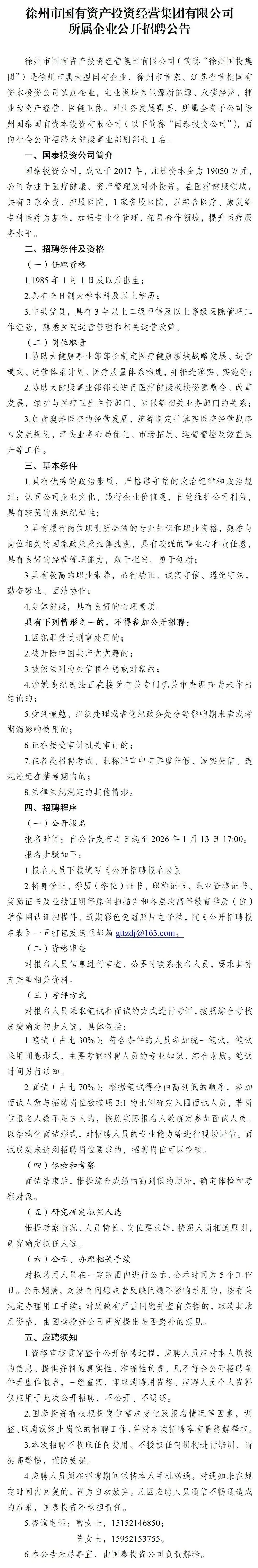 【徐州招聘】徐州市国有资产投资经营集团有限公司所属企业国泰投资公开招聘公告