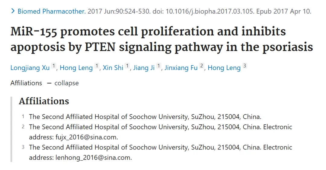 2017年,苏州大学附属第二医院团队于Biomedicine &Pharmacotherapy 发表名为“MiR-155 promotes cell proliferation and inhibits apoptosis by PTEN signaling pathway in the psoriasis”的论文,研究结果表明,下调 miR-155 可通过 PTEN 信号通路显著抑制银屑病细胞的增殖、迁移和侵袭,并促进其凋亡。miR-155 可能在银屑病的病程进展中发挥着类似癌基因的促炎 / 促增殖作用。近期,iFigures系统用户发现,该文章疑似存在图像重复问题。