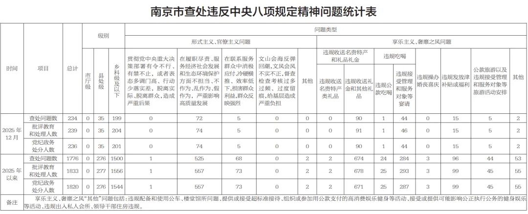 ▶ 2025年12月,全市共查处违反中央八项规定精神问题234起,批评教育和处理239人,其中党纪政务处分236人。
