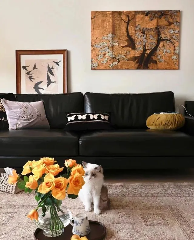类似效果,我家用的是灰蓝色墙漆,地毯选了淘宝定制款,900元2×2.8米,支持光脚踩。装饰上只挂了孩子的画和朋友旅行带回的小木雕,虽然和教授家没法比,但每一件物品都有来历,用起来不心疼。对比那些花大价钱买的“艺术画”,反而日常很少有存在感。