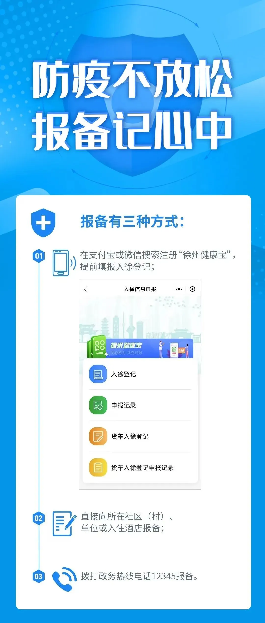 当前,国内疫情呈现传播范围广、传播链条多、疫情波及范围广的特点,我市面临“外防输入、内防反弹”双重压力,防控形势复杂严峻。省外来徐返徐人员,特别是新疆维吾尔自治区,内蒙古自治区,重庆市,天津市,河北省,河南省郑州市,广东省广州市,山东省济南市,青海省西宁市,四川省成都市,陕西省西安市、榆林市榆阳区,辽宁省沈阳市,吉林省长春市、松原市,湖北省武汉市,云南省昆明市,山西省吕梁市,甘肃省兰州市,宁夏自治区银川市等重点涉疫地区来徐返徐人员要及时主动报备,可以通过“徐州健康宝”、12345政务热线电话,或直接拨打所在社区(村)、单位(宾馆)电话报备,配合落实各项健康管理措施。