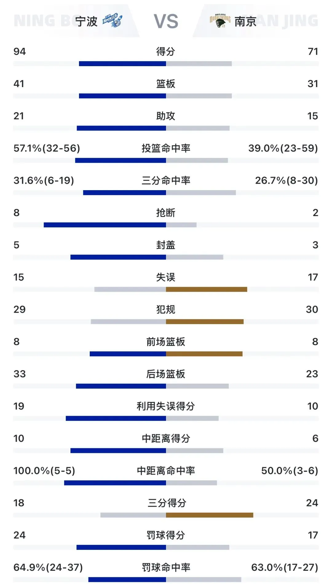 开场宁波队状态不俗,内外连线,法尔吃饼完成空中接力,为球队拿下首分。首节宁波队凭借突破连续造成杀伤,迅速取得比分领先,局面明显占优势,领先6分进入下半场。易边再战,宁波队攻防两端持续给南京施压,一波流拉开比分,以76:50大比分领先进入第四节。末节,宁波队继续稳扎稳打,南京队无力回天,最终宁波町渥男篮以94:71大胜南京天之蓝。希望宁波队保持这种势头,一路高歌猛进!