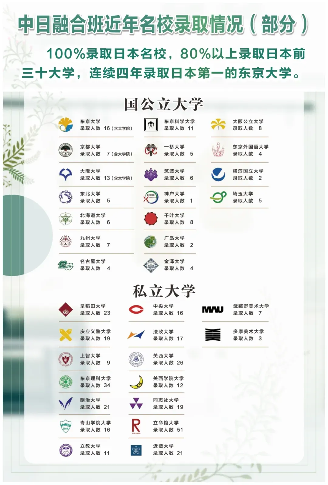 自2009年开办以来,“中日班”学生全部进入日本知名大学本科学习。寿梁羽、洪汉唐、蒋宝莉、江南、朱逸泓、周恩瑞、包成伟、刘瑞、马语含、王凌煜、孙亦婧、陈曦辉、王佳怡、袁媛、戴思琪、王清扬、谢思源、王小禾,周佳颖、李辰佳、钱婧、王子钰、陈芊、陈诗珺、杨雨欣、周阳、莫智闻、李伊婧、华思颐、许朔、胡泽起、曹俐玟、王翊天、孙倏骜、王家琛、张舒贻、尤斐、周抑扬、曹占妮、陈艺璇、包晗等数十位同学顺利被东京大学、京都大学、大阪大学、东京工业大学、名古屋大学、一桥大学等日本前十国公立大学,以及 “私立双雄”早稻田和庆应义塾大学录取。陆玉恬、周思辰、沈心、张厚禄、洪晨悦、丁一、沈佳怡、姚思妤、张登乘、黄莉惠、徐鲤、王希平、丁宁、石孟玉、郁畅、夏一成、陈斯佳、钮奕昊、张方涵、朱凌、曹文妍、陶理勇、李晓怡等数百名同学顺利被东京医科齿科大学、多摩美术大学、武藏野美术大学、筑波大学、千叶大学、上智大学、“ GMARCH”和“关关同立”等日本知名大学录取。