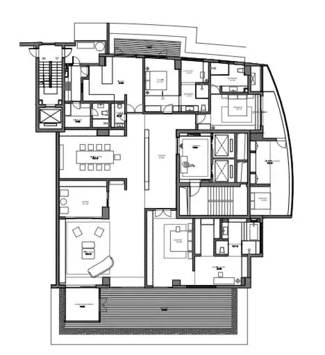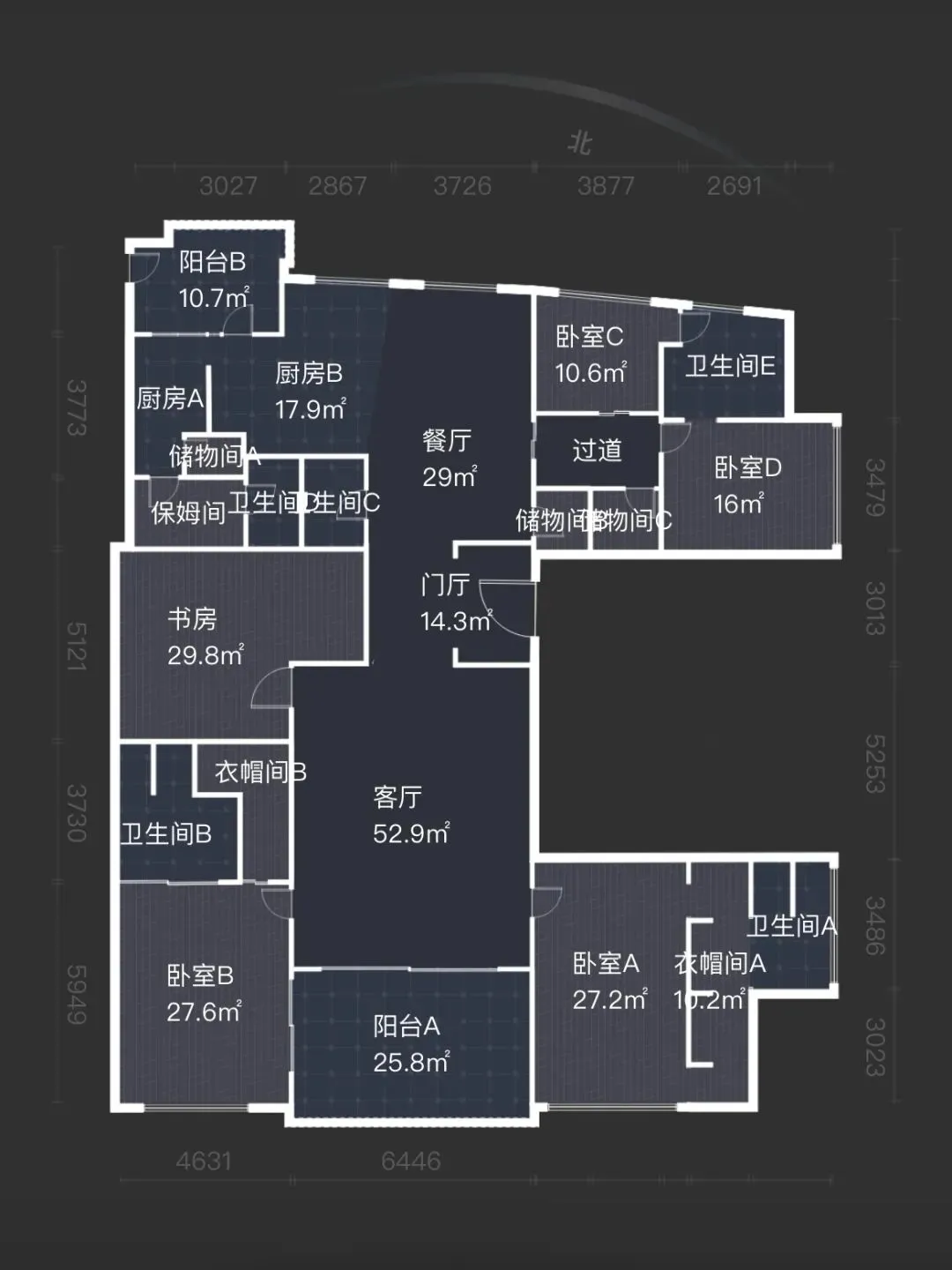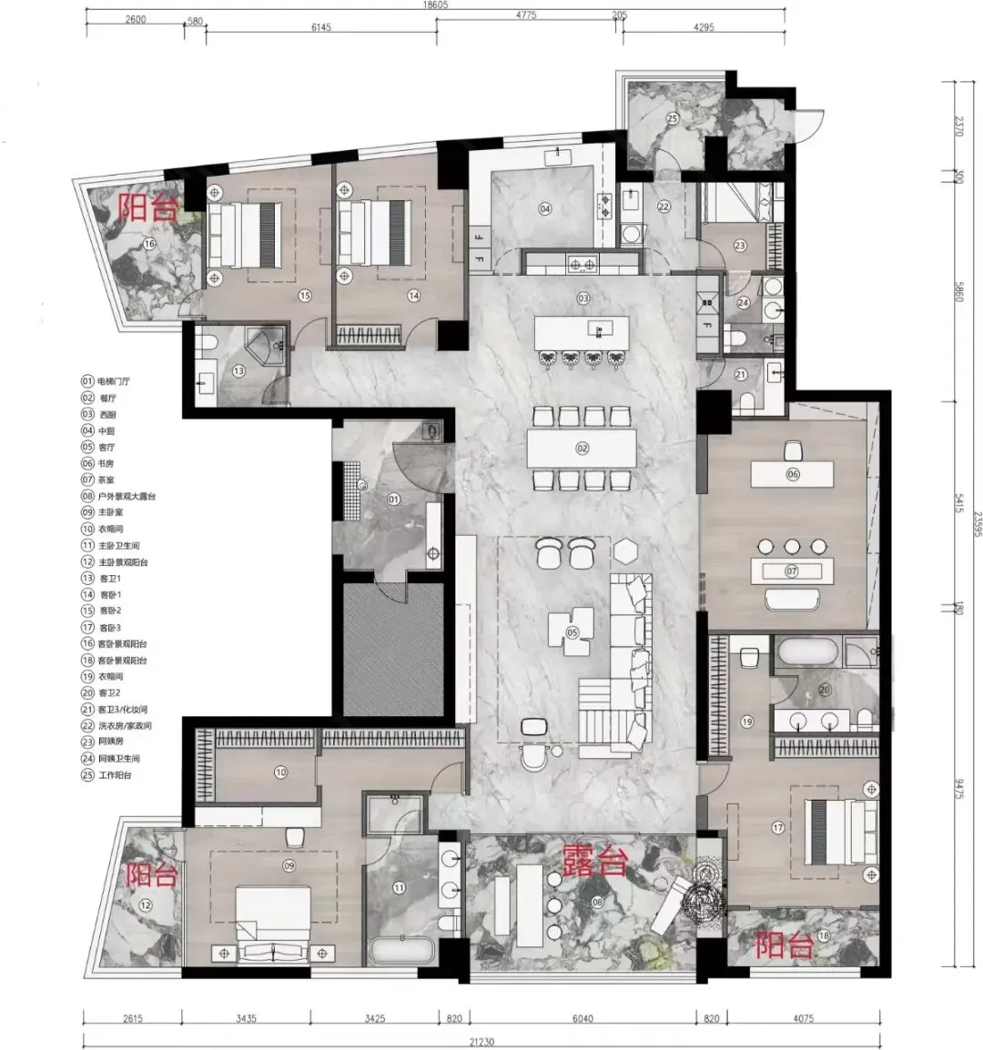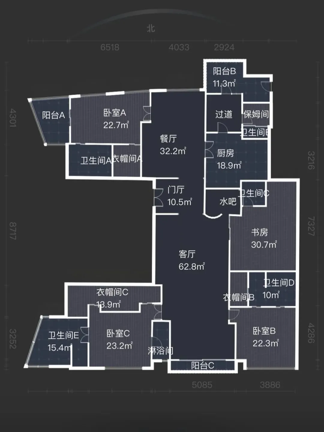 房型为A型(483㎡)B型(478㎡)两种,可以自由分割,顶楼复式,建筑面积568㎡,带150㎡的露台。