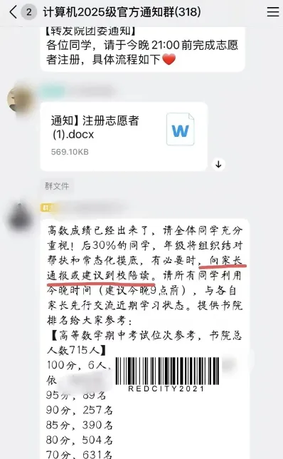 近日,有网友发文称,南京理工大学致知书院计算机2025级官方群内发布一则通知,其中提到:高数成绩现已公布,排名后30%的同学,年级将组织结对帮扶与常态化摸底,“必要时会向家长通报,或建议到校陪读”。通知还附有高数期中考试成绩位次参考,并提醒所有同学与家长提前沟通近期学习状态。