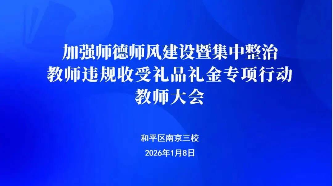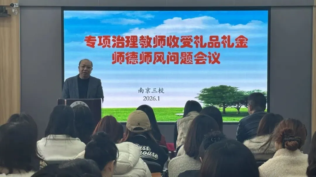 为深入贯彻落实省、市、区关于加强师德师风建设暨集中整治中小学(幼儿园)教师违规收受礼品礼金专项行动的会议精神,1月8日,南京三校迅速行动,组织召开全体教师大会,传达专项行动要求,并对师德师风建设暨集中整治教师违规收受礼品礼金专项整治工作进行动员部署。