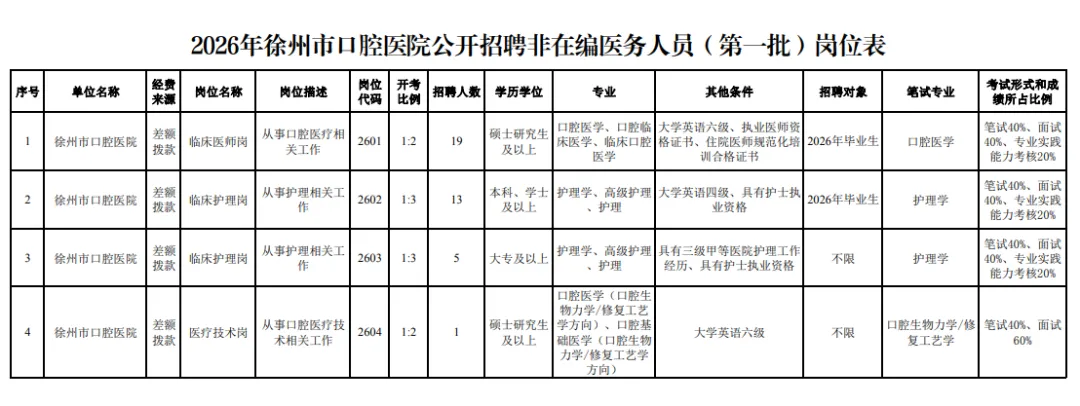 本次公开招聘考试方式详见《岗位表》中“考试形式和成绩所占比例”栏,由徐州市口腔医院统一组织实施。