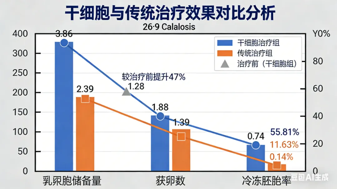 第一次促排卵周期里,干细胞治疗组平均能拿到 1.88 个卵子,比传统治疗组的 1.39 个要多不少;更关键的是,和治疗前自己的情况比,干细胞治疗组的获卵数从 1.28 个涨到了 1.88 个,卵巢对促排卵的反应明显变强了。