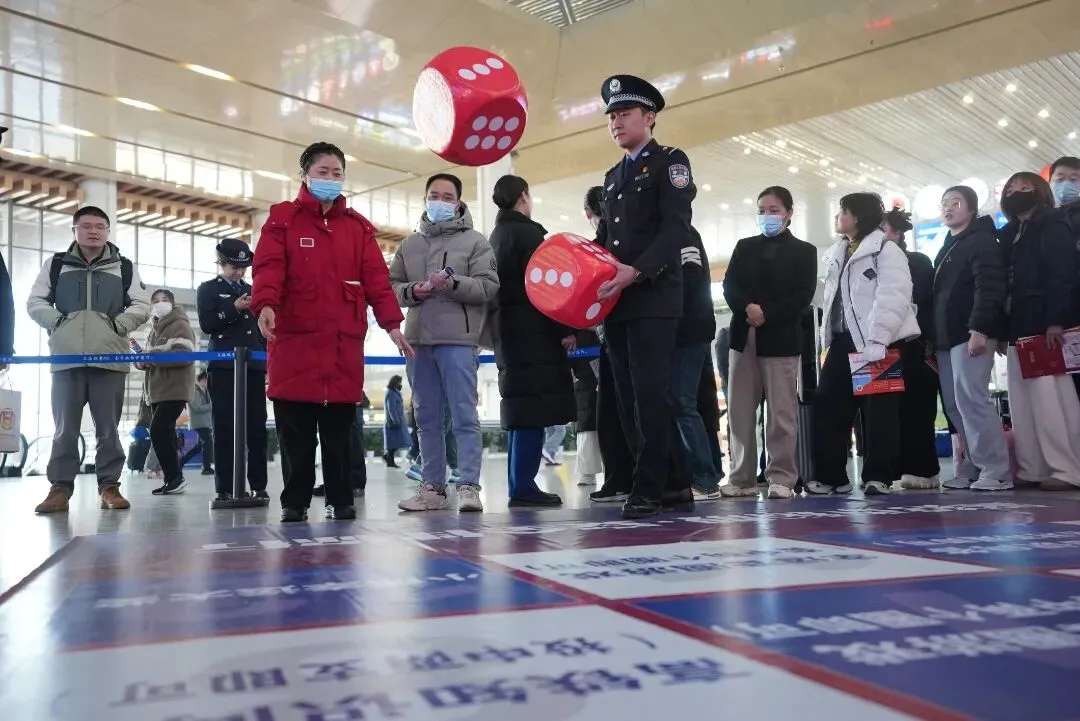 宿迁站派出所的活动更是别出心裁!在宿迁站三楼候车室,民辅警将警民互动问答与法律知识宣讲相结合,旅客们在欢声笑语中完成挑战、领取奖品,不知不觉就把安全出行理念记在了心间。