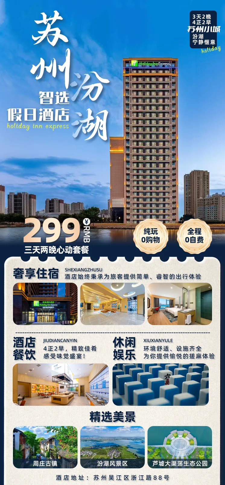苏州四钻【汾湖智选假日酒店】3天2晚299元4正2早!汾湖·醉江南的诗意栖居地!享免费棋牌&健身房!