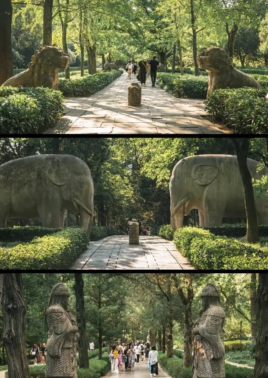 但南京的历史,是贴在地上的,伸手就能碰到。我最爱去明孝陵的石象路,尤其是秋天。那时候,神道两旁的银杏树叶子全黄了,跟一把把金色的小扇子似的,落叶铺了一地,踩上去沙沙响,跟海浪打沙滩的声音似的。石象、石马、石骆驼,安安静静站在神道两边,一站就是六百多年。它们的轮廓被落叶勾出来,倒像海浪退去后,留在沙滩上的化石。伸手摸一摸那些石兽,指尖划过坑坑洼洼的表面,能感觉到岁月的痕迹。它们见过明朝的开国大典,见过清朝改朝换代,见过民国的风风雨雨,也见过现在的太平日子。它们是历史的见证者,是南京的 “深海化石”。