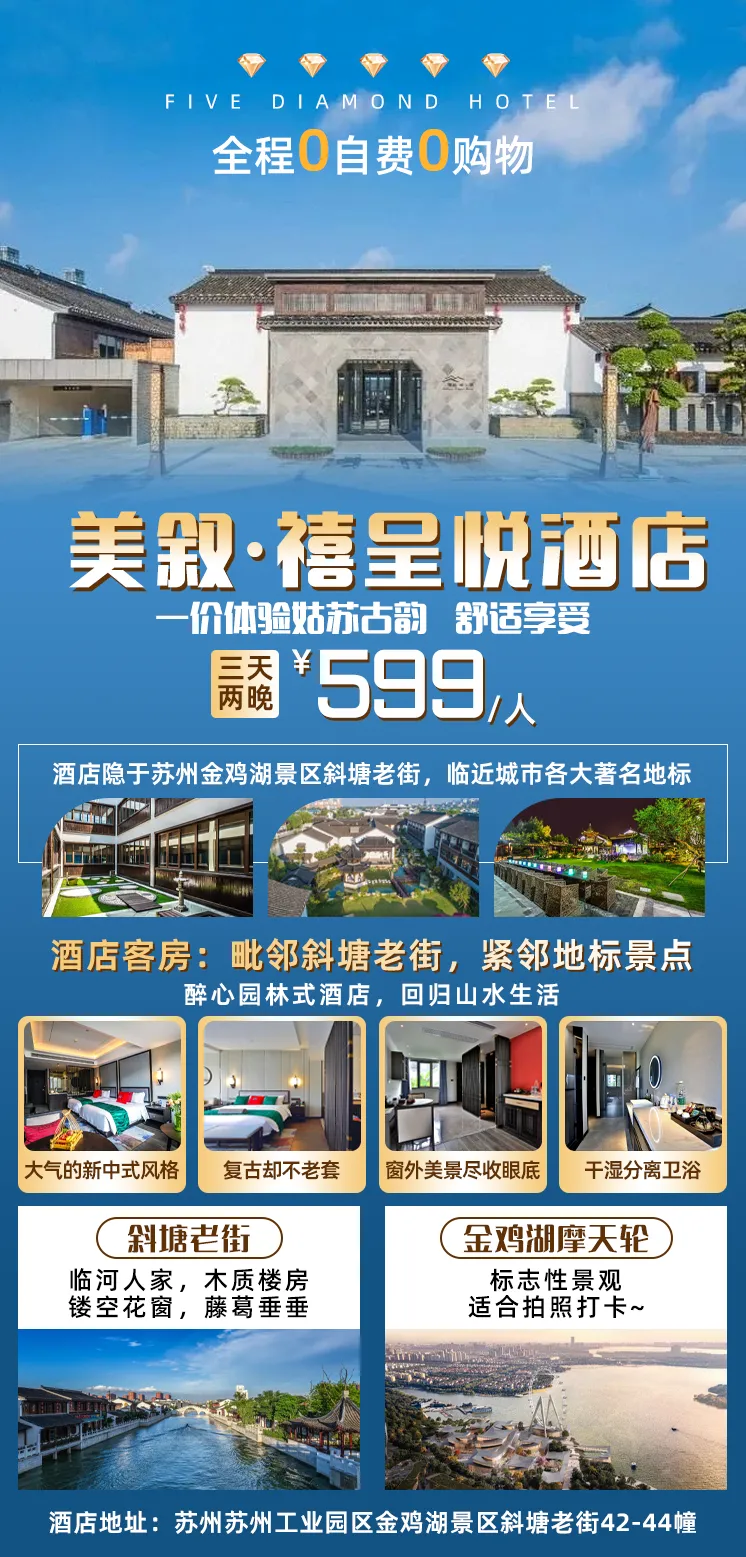 苏州五钻【美叙·禧呈悦酒店】3天2晚599元每人,包6餐!享棋牌&KTV!斜塘河畔老街巷口,自带10000㎡私家园林!