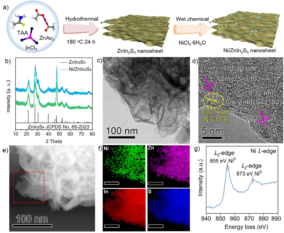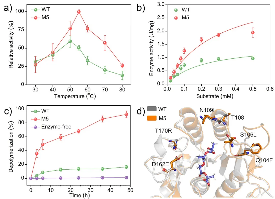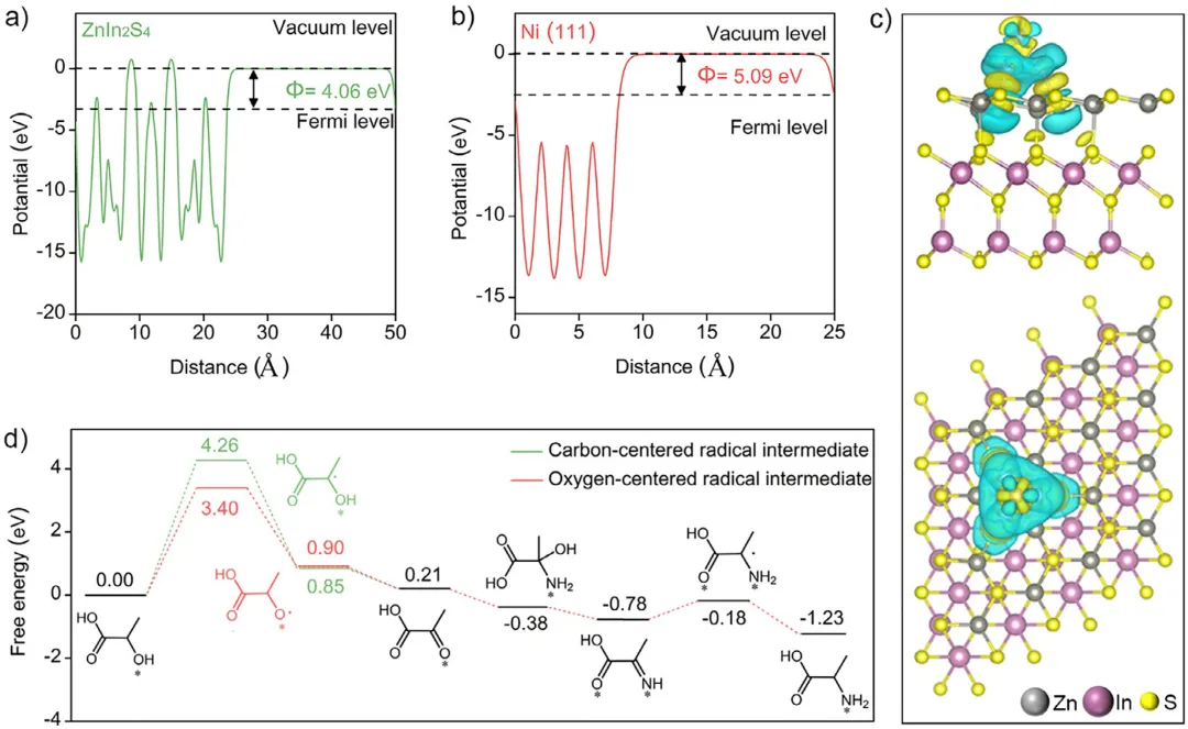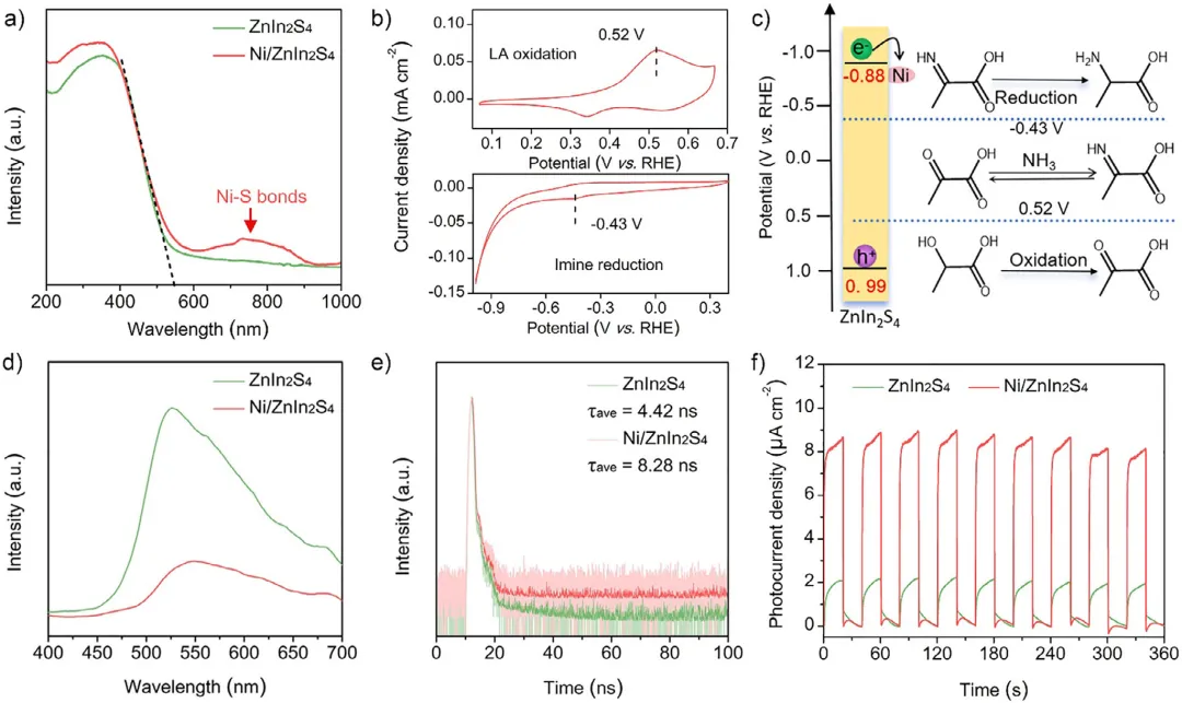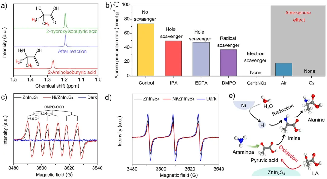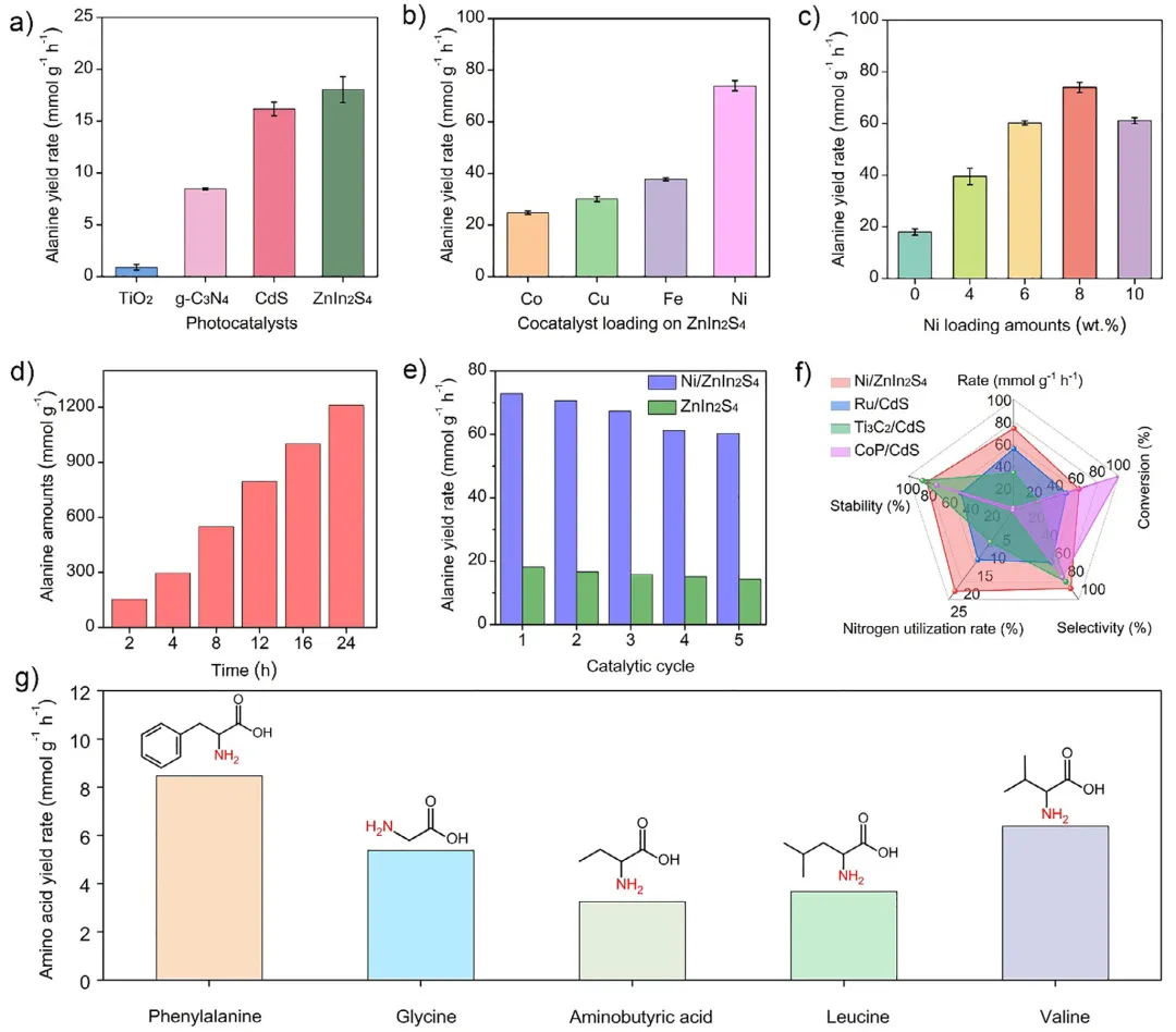 将废弃塑料升级回收为氨基酸等大宗商品化学品,是实现负碳排放并推动循环碳经济的有前景路径。然而,现有的热催化方法通常需要苛刻条件;光催化升级回收虽在温和条件下进行,却依赖高温水解步骤对塑料进行预处理,削弱了其整体实用性。2026年1月7日,南京农业大学邱博诚、华东理工大学练成、南京工业大学Jie Zhou、在国际知名期刊Angewandte Chemie International Edition发表题为《Solar-Biohybrid Upcycling of Polylactic Acid Plastics to Alanine》的研究论文,Mengmeng Du、Haolan Tao、Xuyun Guo、Bin Xie为论文共同第一作者,周海峰、尹聪聪、张绪穆、Jie Zeng为论文共同通讯作者。在本文中,作者报道了一种生物-光催化杂合系统,可在常温常压下将聚乳酸(PLA)塑料转化为丙氨酸。该集成工艺首先利用来源于Micromonosporasp.菌株的工程肽酶,在55 °C、pH=10条件下将聚乳酸(PLA)酶解为乳酸(LA),转化率达 92%。水解液无需任何纯化,直接输入光合成系统,在Ni/ZnIn2S4催化剂作用下,以氨为氮源,将乳酸单体转化为丙氨酸。该光催化过程通过氧中心自由基中间体路径进行,丙氨酸产率为60%,生成速率高达61.91 mmol g-1h-1。生命周期评估表明,与单步热催化或光催化工艺相比,本串联生物-光转化系统显著降低了碳足迹,为低成本原料高值化利用建立了可持续新路线。丙氨酸是蛋白质合成的基本单元,广泛应用于医药和食品工业。传统合成依赖Strecker路线,需使用高毒氰化物和非再生醛类,流程复杂、环境负荷大。热催化法虽可用廉价乳酸(LA)为原料,但需高温高压,条件苛刻。光催化技术可在温和条件下实现LA→丙氨酸;Fu等报道CdS/Ti3C2 MXene催化剂活性达33.72 mmol g-1 h-1。若LA来自废弃聚乳酸(PLA)的解聚,则PLA→丙氨酸兼具经济与环境价值。有研究尝试PLA→丙氨酸:Chen等提出“氨解-光催化”两步一锅法,CoP/CdS在80°C氨水中产率为2.4 mmol g-1h-1,但氨解动力学缓慢。酸碱水解虽快,却需高温/高浓酸碱,能耗高、碳排大,且与后续温和光催化不匹配。酶促水解可在30–65 °C、pH=7-10温和条件下将PLA→LA,但PLA分子量与结晶度越高,酯键越难被酶触及,需匹配酶最适pH/温度。因此,把温和高效解聚与下游转化串联,并兼容不同PLA性质,是尚未被探索的难点。在本文中,作者提出了太阳能-生物杂合级联系统,在常温常压下先酶促解聚PLA→LA,再光催化LA→丙氨酸。首先,五点位突变体M5在55 °C、pH=10下将PLA解聚为LA,转化率>90%,比活较野生酶显著提升。粗水解液无需纯化,直接在Ni0修饰ZnIn2S4(Ni/ZnIn2S4)上可见光(λ>400 nm)转化为丙氨酸,产率60%,生产速率61.91 mmol g-1 h-1。Ni0有效抑制光生载流子复合。实验与密度泛函理论(DFT)计算表明,丙酮酸生成与亚胺加氢是关键步骤,氧中心自由基为LA→丙氨酸的速率决定步骤。该生物-光合成路线在温和条件下把低成本资源转化为高附加值化学品,可持续且切实可行。图1:酶催化PLA水解性能。a)温度-活性曲线:工程酶M5最适55 °C,70 °C仍保留>50%活性,优于野生WT。b)Michaelis-Menten拟合:M5对底物亲和力与Vmax均高于WT。c)时间-转化率:M5在48h内将50 g L-1PLA粉末水解92%,WT仅16%。d)结构叠合:5处突变(Q104F/S106L/N109I/D162E/T170R)位于底物结合沟,形成更紧凑疏水口袋。图2:光催化剂构筑与表征。a)合成路线:先水热得ZnIn2S4纳米片,再湿法沉积Ni2+,还原后得Ni/ZnIn2S4。b)XRD:仅见六方ZnIn2S4衍射峰,Ni高度分散无颗粒峰。c–e)TEM/HAADF-STEM:纳米片形貌保持,Ni元素均匀分布。f)EELS元素图:Zn、In、S、Ni均匀共存。g)NiL-edge:855/873 eV证实Ni0为主。图3:光催化LA→丙氨酸性能。a)催化剂筛选:ZnIn2S4本征活性18 mmol g-1 h-1,为基线最高。b)共催化剂筛选:Ni提升最显著,优于Co、Cu、Fe。c)Ni载量优化:8 wt%Ni时火山峰顶,活性73.96 mmol g-1 h-1。d)时间-产率曲线:前12 h线性增长,24 h后趋缓(底物耗尽)。e)循环实验:5次循环保留83%初活性,结构无衰减。f)文献对比:本工作速率与氮利用率均居报道最高。g)底物拓展:五种α-羟基酸均可高效转化为对应α-氨基酸。图4:光电化学与能带分析。a)UV-vis-DRS:Ni引入后600-900 nm出现新吸收带,归因于Ni-S。b)CV:LA氧化峰0.52 V,亚胺还原峰-0.43 V,催化剂能带位置匹配。c)能带示意图:价带0.99V可氧化LA,导带-0.88 V可还原亚胺。d)PL:Ni/ZnIn2S4发光强度显著降低,载流子复合受抑。e)时间分辨PL:平均寿命由4.42 ns延长至8.28 ns。f)瞬态光电流:Ni助催化剂提升光电流响应,电荷分离效率增强。图5:机理研究。a)探针实验:无α-H的2-羟基异丁酸不被胺化,排除直接取代机理。b)捕获剂实验:空穴、自由基、电子均不可或缺;O2气氛完全抑制反应。c)ESR:DMPO捕获到O-中心自由基(OCR)六重峰,无·OH信号。d)TEMPO-h+:光照下空穴信号减弱,证实h+参与氧化。e)反应路径图:提出“OCR路径”——h+氧化LA→丙酮酸→亚胺→e-还原→丙氨酸。图6:密度泛函理论(DFT)计算。a-b)功函数:ZnIn2S4 4.06 eV,Ni 5.09 eV,电子自发流向Ni。c)差分电荷密度:Ni位点电子富集,为还原中心。d)自由能图:OCR路径能垒3.40 eV,低于CCR路径4.26 eV;亚胺氢化能垒0.6 eV,整体热力学可行。图7:真实PLA串联升级与LCA。a)流程图:废吸管→酶解→原液→光催化→丙氨酸。b)速率对比:M5水解液耦合光催化产率61.91 mmol g-1h-1,是WT的4.6倍。c)1HNMR:72h丙氨酸收率60%,为主要产物。d)GHG排放:本工艺3.66 kgCO2 kg丙氨酸-1,远低于单步光催化(8.88)与热催化(43.67)。综上,作者构建了一条“阳光驱动-生物-光催化”级联路径,把废弃聚乳酸(PLA)塑料在常温常压下高效转化