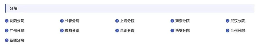 目前,中科院官网“组织机构”公布的分院包括:沈阳分院、上海分院、武汉分院、广州分院、成都分院、昆明分院、西安分院、兰州分院、新疆分院。