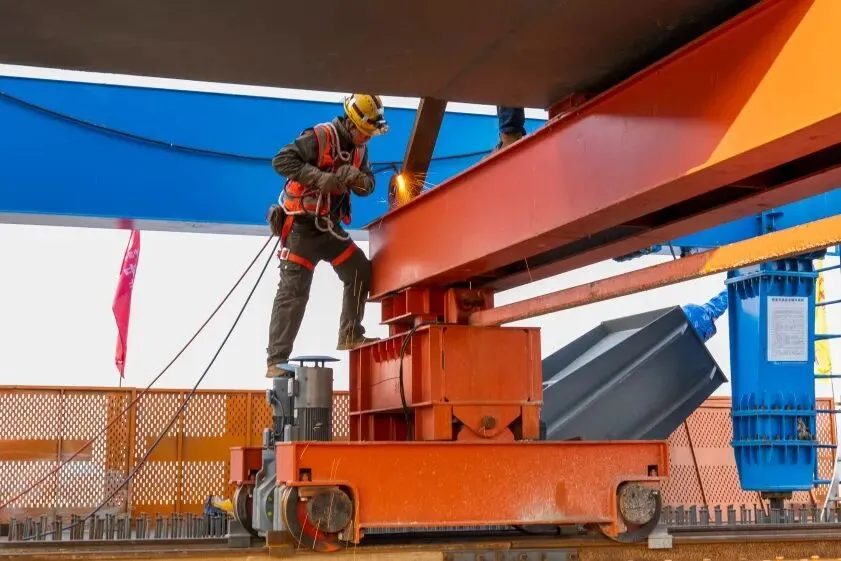为实现这场跨越数百米水域的“精准牵手”,项目部成立专项技术攻关小组,以科技赋能破解技术难题,目前项目已成功申报5项专利(含1项发明专利)。针对测量难题,项目团队优化应用锚索管中心定位辅助装置,大幅提升定位精度与作业效率,并研发应用《大跨度桥梁智能型桥面吊机吊装施工工法》,结合模块化设计与智能监控,显著提高钢箱梁拼装精准度和效率,节约工程成本约230万元,为同类工程提供了成熟技术借鉴。