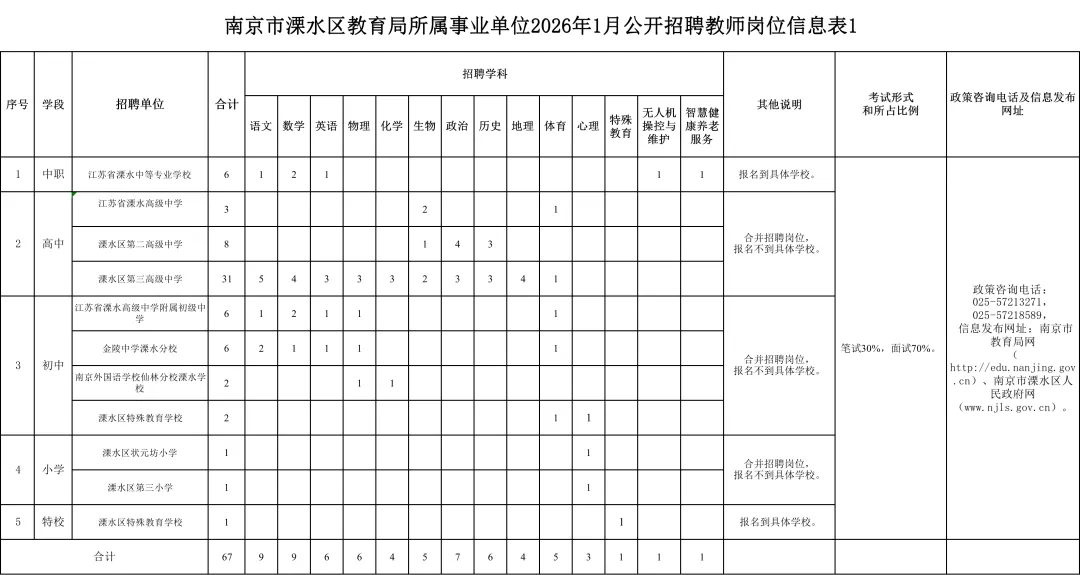 本次招聘相关信息在南京市教育局网(http://edu.nanjing.gov.cn)、南京市溧水区人民政府网(http://www.njls.gov.cn)等网站发布。具体的招聘学校、招聘岗位、数量等详见附件《南京市溧水区教育局所属事业单位2026年1月公开招聘教师岗位信息表1》(附件1,以下简称《岗位信息表1》《南京市溧水区教育局所属事业单位2026年1月公开招聘教师岗位信息表2》(附件2,以下简称《岗位信息表2》)。