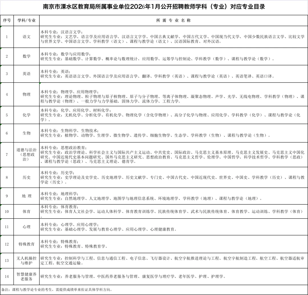 6.符合《南京市溧水区教育局所属事业单位2026年1月公开招聘教师学科(专业)对应专业目录》(附件3)中的专业要求。