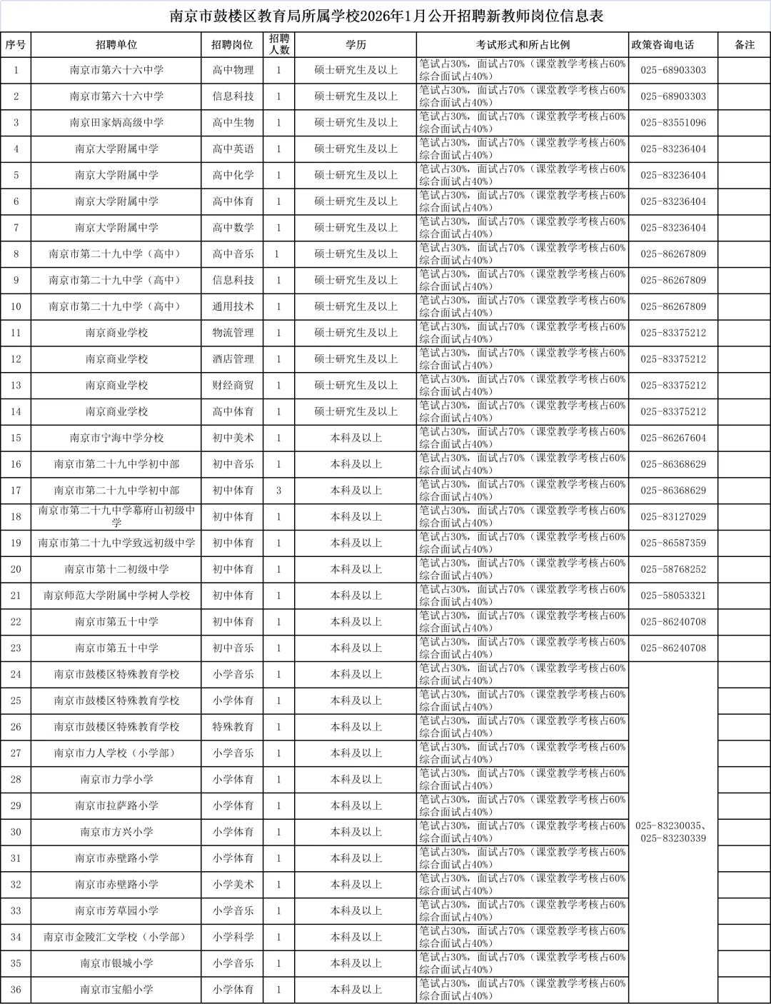 本次招聘相关信息在南京市鼓楼区人民政府网(http://www.njgl.gov.cn)、南京市教育局网(http://edu.nanjing.gov.cn)网站发布。具体的招聘单位、招聘岗位、招聘数量等详见《南京市鼓楼区教育局所属学校2026年1月公开招聘新教师岗位信息表》(附件1,以下简称《岗位信息表》)。