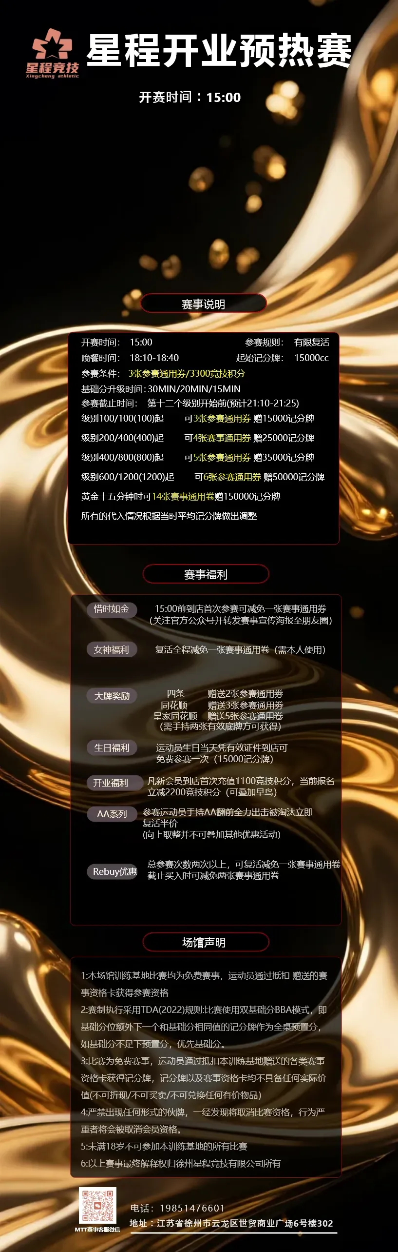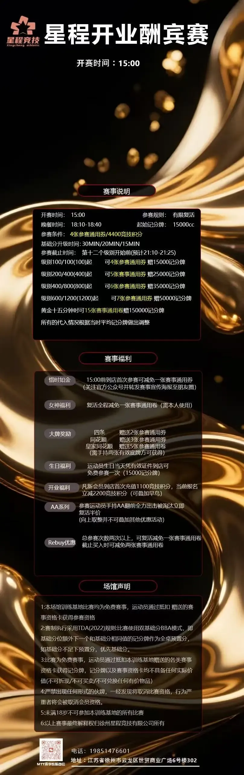 15点前到店转发本文/海报至朋友圈减免一张赛事通用券参赛运动员手持AA翻前全下被淘汰立即复活半价女士全程复活减免一张赛事通用券