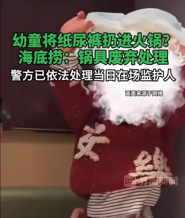 1月8日,一则流传于网上的视频引发热议。视频显示,一幼童将手中的纸尿裤扔到了火锅中,网友透露该店为海底捞一门店。有网友愤怒表示,“希望引起重视,尽快处理。”
