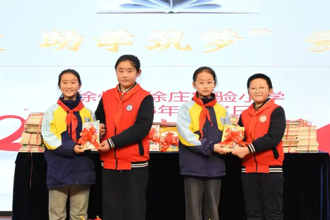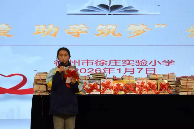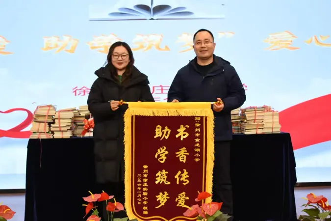 1月7日,“书香传爱,助学筑梦”爱心捐书仪式在徐州市徐庄实验小学温情举行。金龙湖小学学生代表将精心募集的千册图书赠予徐庄实验小学。仪式上,两校学生代表深情发言并完成书籍交接,传递知识与祝福。徐庄实验小学校长刘松向金龙湖小学校长张晨晨赠送锦旗,感谢这份无私情谊。本次活动以书为桥,不仅传递了温暖与知识,更架起了两校学子心灵相连的友谊之桥。