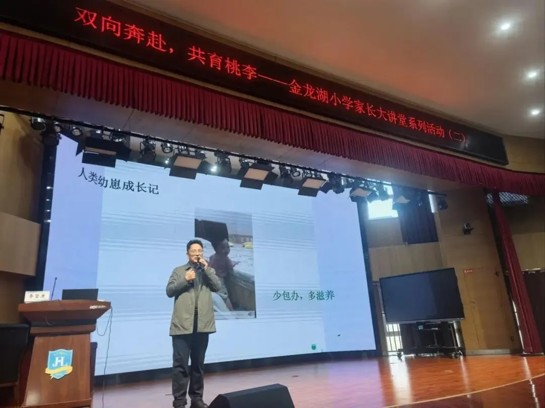 2026年1月9日下午,金龙湖小学“家长大讲堂”系列活动(二)在西校区报告厅举行。本期活动特邀市德育专家李建庚校长为家长朋友做家校共育主题讲座《双向奔赴 共育桃李》。从亲子沟通技到家校协作的智慧,每位家长都收获满满。正如李校长所说,孩子的成长,是家校共育的答卷;彼此的信任,是我们携手前行的底气。