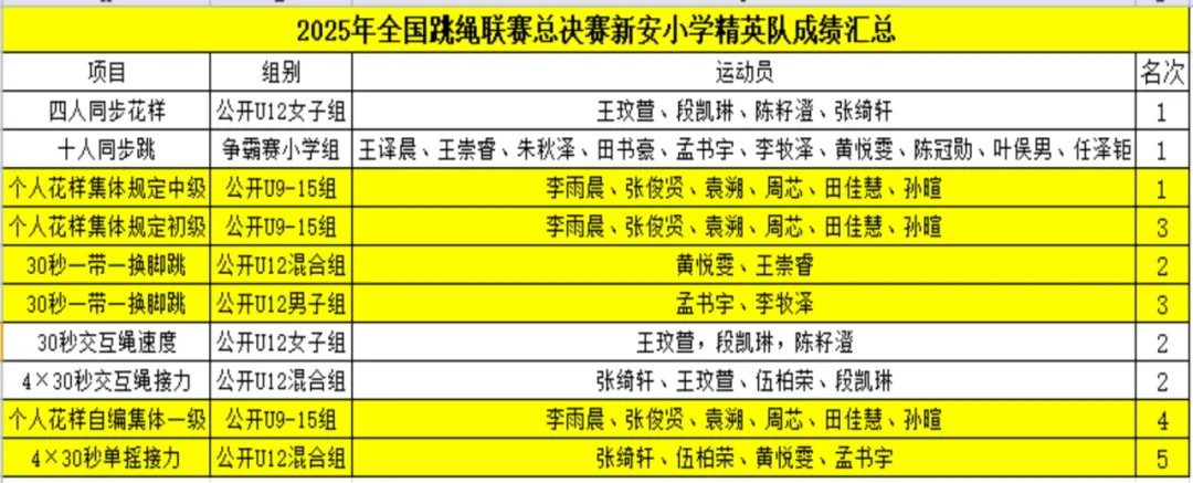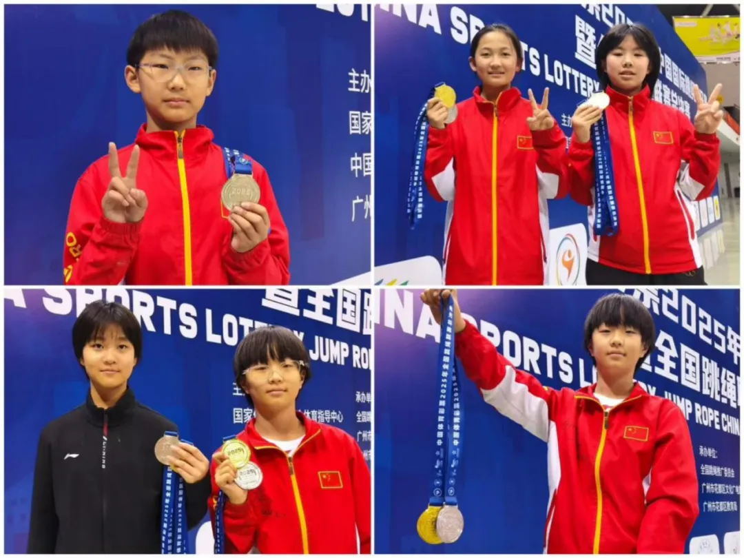 2025年12月25日-29日,代表国内跳绳最高竞技水平的全国跳绳总决赛在广州花都东风体育馆盛大举行。本次赛事汇聚了来自全国23个省、自治区、直辖市的221支队伍、2400余名跳绳精英,共同向年度最高荣誉发起冲击。新沂市新安小学跳绳队派出21名队员参赛,凭借出色发挥,共夺得个人项目4金、9银、2铜,集体项目2项冠军、1项季军。