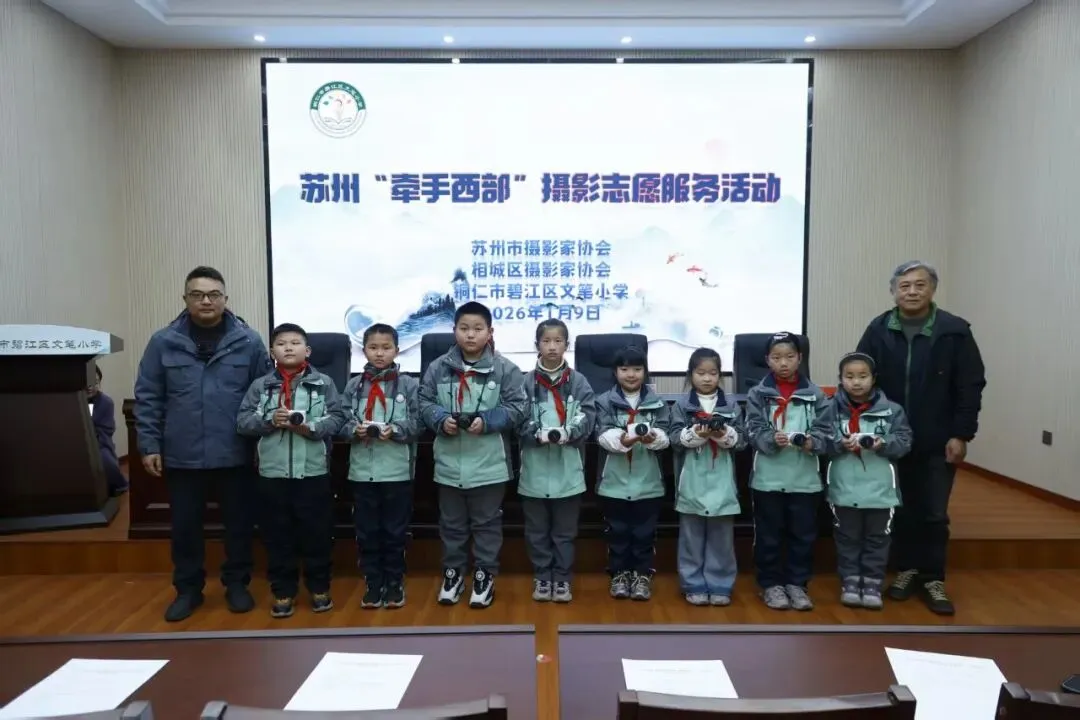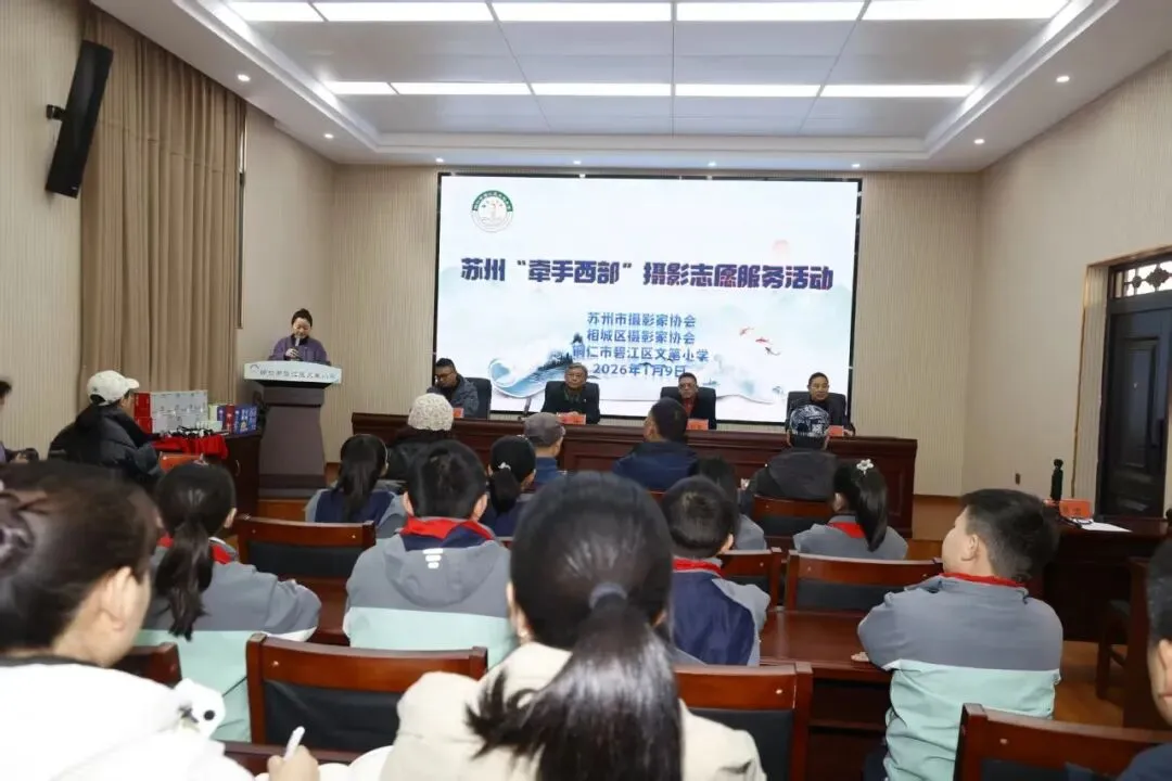 跨越山海十二载,爱心帮扶不停歇。自2014年起,苏州市摄影家协会志愿者团队持续奔赴铜仁市碧江区开展摄影公益帮扶活动,为山区儿童打开艺术视野、点亮逐梦之路。1月9日,苏州“牵手西部”摄影志愿服务活动在碧江区文笔小学启幕,为这份跨越千里的情谊再添新篇。江苏省摄影家协会副主席、苏州市摄影家协会主席龚刚,苏州市摄影家协会副主席、相城区摄影家协会主席郁大波,铜仁市摄影家协会主席郑剑玺等嘉宾出席活动,与文笔小学师生共同参与这场文化教育盛宴。