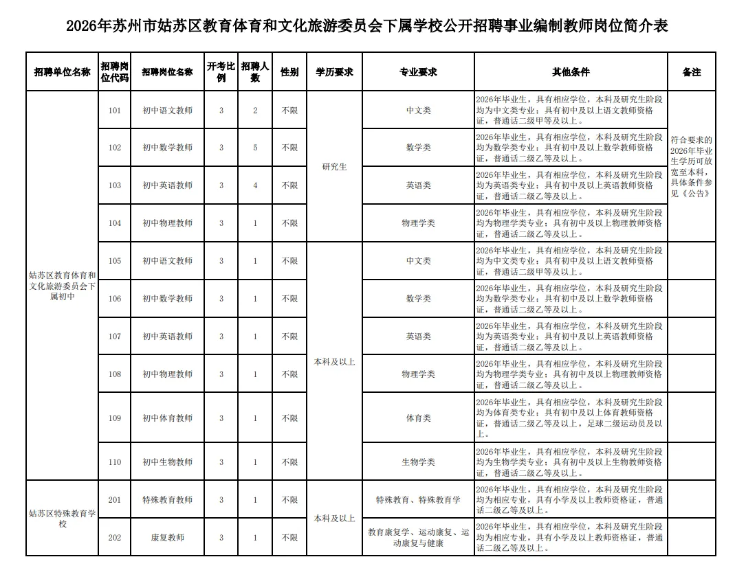 (2)本次招聘的笔试开考比例为1:3,报名结束后达不到开考比例的岗位,由姑苏区教育体育和文化旅游委员会核减招考计划数,直至取消该岗位。被取消岗位的报名成功人员可在2026年1月19日9:00-16:00申请改报其他符合条件的岗位,逾期未改报或改报不成功的,统一办理退费手续。被取消岗位的报名成功人员需保持联系方式畅通,以便通知核销岗位及改报事宜,联系不到者视为自动放弃。