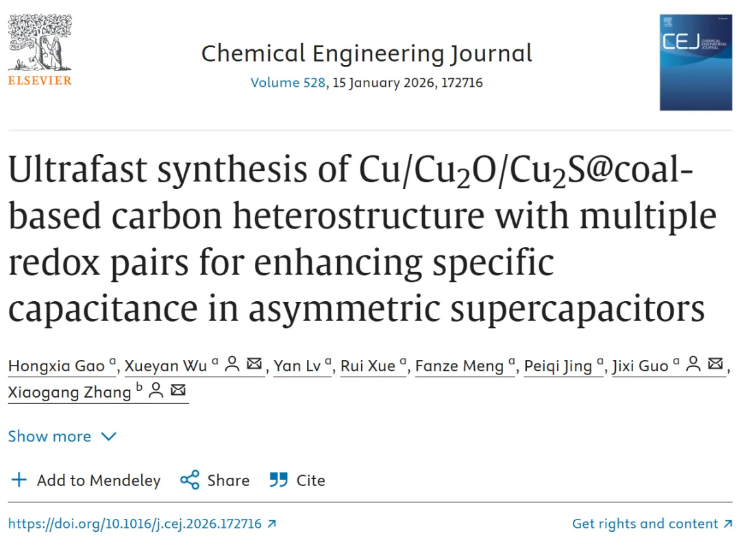 文献信息:Hongxia Gao, Xueyan Wu, Yan Lv, Rui Xue, Fanze Meng, Peiqi Jing, Jixi Guo, Xiaogang Zhang. Ultrafast synthesis of Cu/Cu2O/Cu2S@coal-based carbon heterostructure with multiple redox pairs for enhancing specific capacitance in asymmetric supercapacitors. Chemical Engineering Journal, Volume 528, 2026,