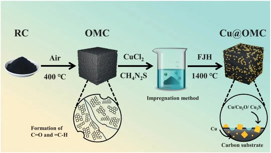 该图展示了从原料煤经低温预氧化处理得到富氧微孔碳,再通过浸渍法与闪蒸焦耳加热工艺负载Cu/Cu₂O/Cu₂S异质结构的全过程。低温预氧化在碳表面引入C=O与=C-H等官能团,为铜前驱体提供均匀锚定位点;闪蒸焦耳加热在极短时间内完成Cu²⁺的还原与硫化/氧化反应,形成与碳基底紧密结合的异质结构,有利于电荷传输与结构稳定。