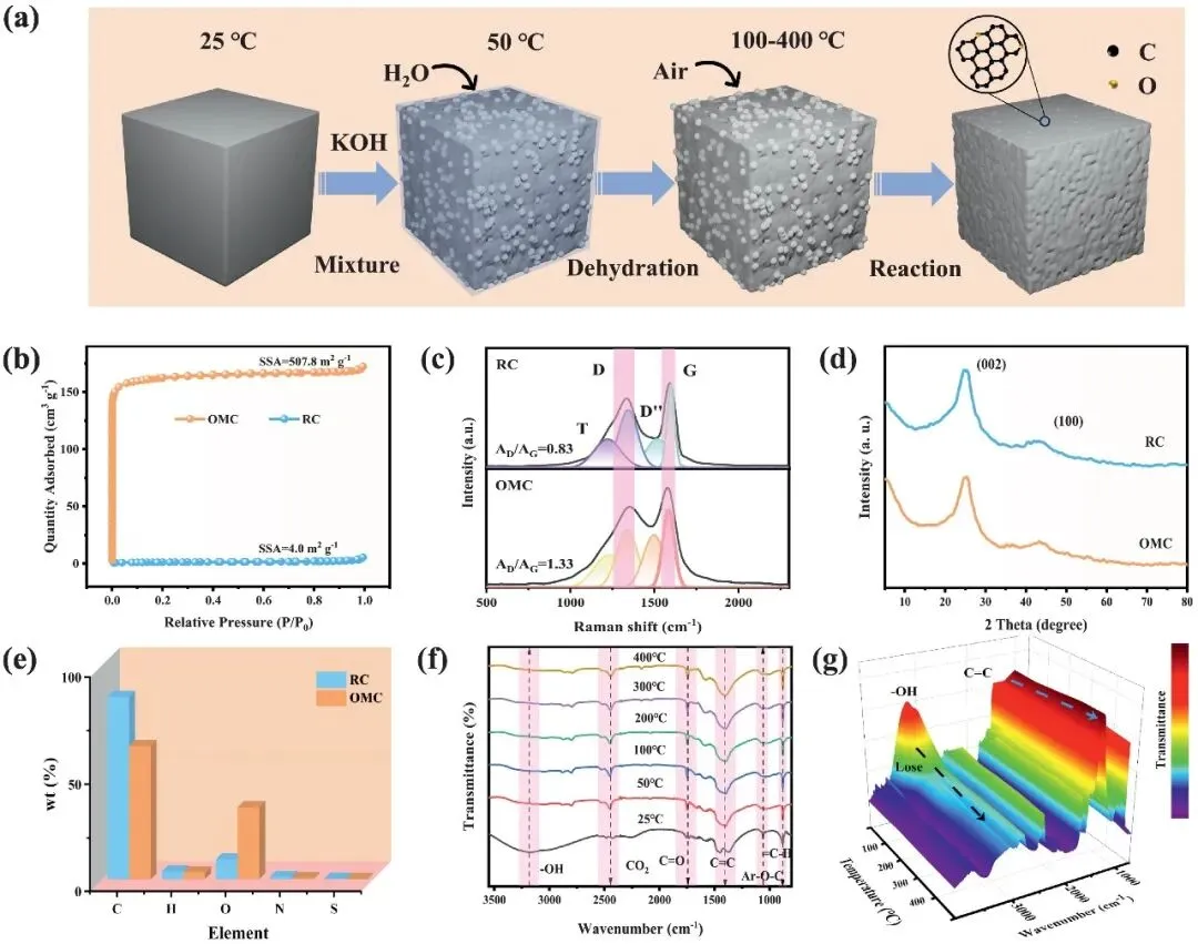 通过N₂吸脱附、Raman、XRD、元素分析及原位红外光谱系统表征了原料煤与预氧化碳的结构演变。预氧化后,碳材料的比表面积从4.0 m² g⁻¹提升至507.8 m² g⁻¹,Raman中I₉/I₆比值增大表明缺陷程度增加,XRD显示其仍为无定形碳结构,元素分析证实氧含量显著提升(从9.41%增至33.67%),原位红外进一步揭示了官能团在加热过程中的动态变化,为后续异质结构的形成提供了活性界面环境。