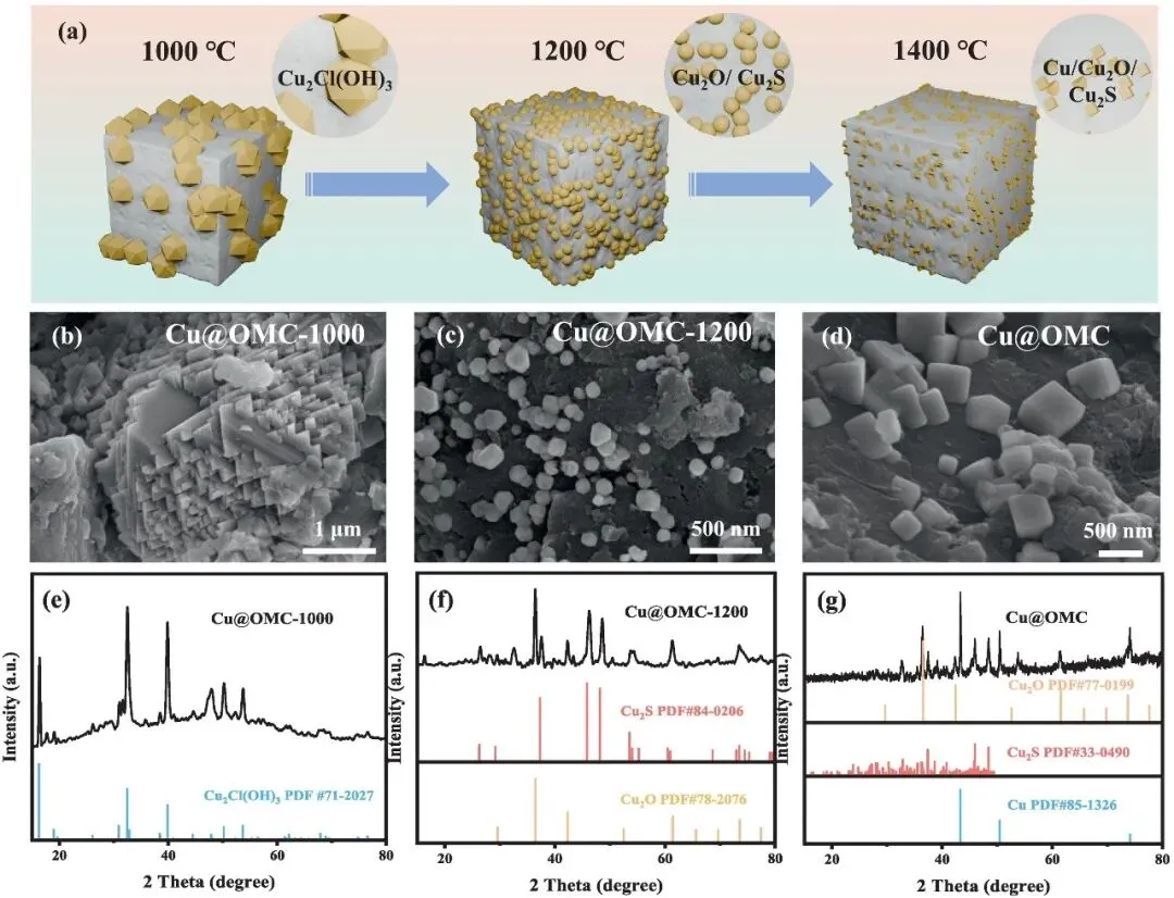 SEM与XPS结果显示,随着闪蒸焦耳加热温度从1000℃升至1400℃,铜基化合物从团聚的Cu₂(OH)₃Cl逐渐转变为均匀分散的Cu₂O/Cu₂S立方体,最终形成Cu/Cu₂O/Cu₂S异质结构。XPS表明Cu的价态从Cu²⁺逐渐转变为Cu⁺与Cu⁰,C 1s谱中C–O–C与C=C键的消耗证实了碳官能团参与反应,促进了低价态铜物种的形成。