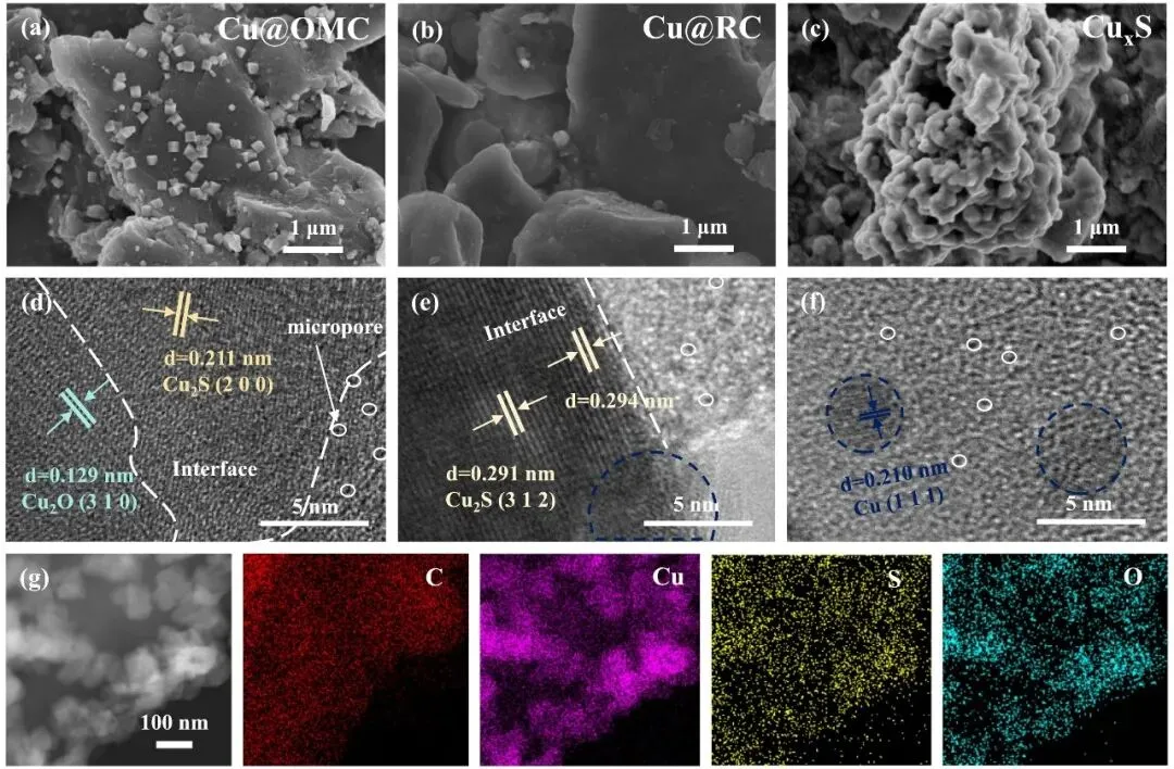 SEM与TEM图像显示,Cu@OMC中Cu/Cu₂O/Cu₂S立方体均匀分散在碳表面,而Cu@RC中化合物分布不均且表面光滑,CuₓS则因缺乏碳载体而严重团聚。HRTEM进一步揭示Cu@OMC中Cu₂S晶格在界面处发生膨胀与畸变,证实了异质结构界面效应的存在。元素mapping表明Cu、O、S元素在结构中分布均匀。
