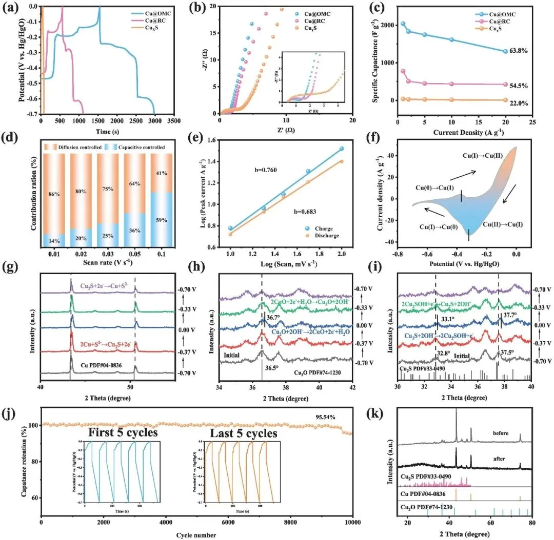 Cu@OMC在1 A g⁻¹下比电容达2041.4 F g⁻¹,远高于Cu@RC与CuₓS。Nyquist图中较小的电荷转移电阻表明其离子传输动力学更优。电容贡献分析显示随着扫速提升,电容控制贡献从14%增至59%,反映其良好的倍率性能。通过ex-situ XRD分析,揭示了Cu/Cu₂O/Cu₂S在充放电过程中通过可逆的氧化还原反应贡献电容,并表现出优异的循环稳定性(10,000次循环后容量保持率95.54%)。