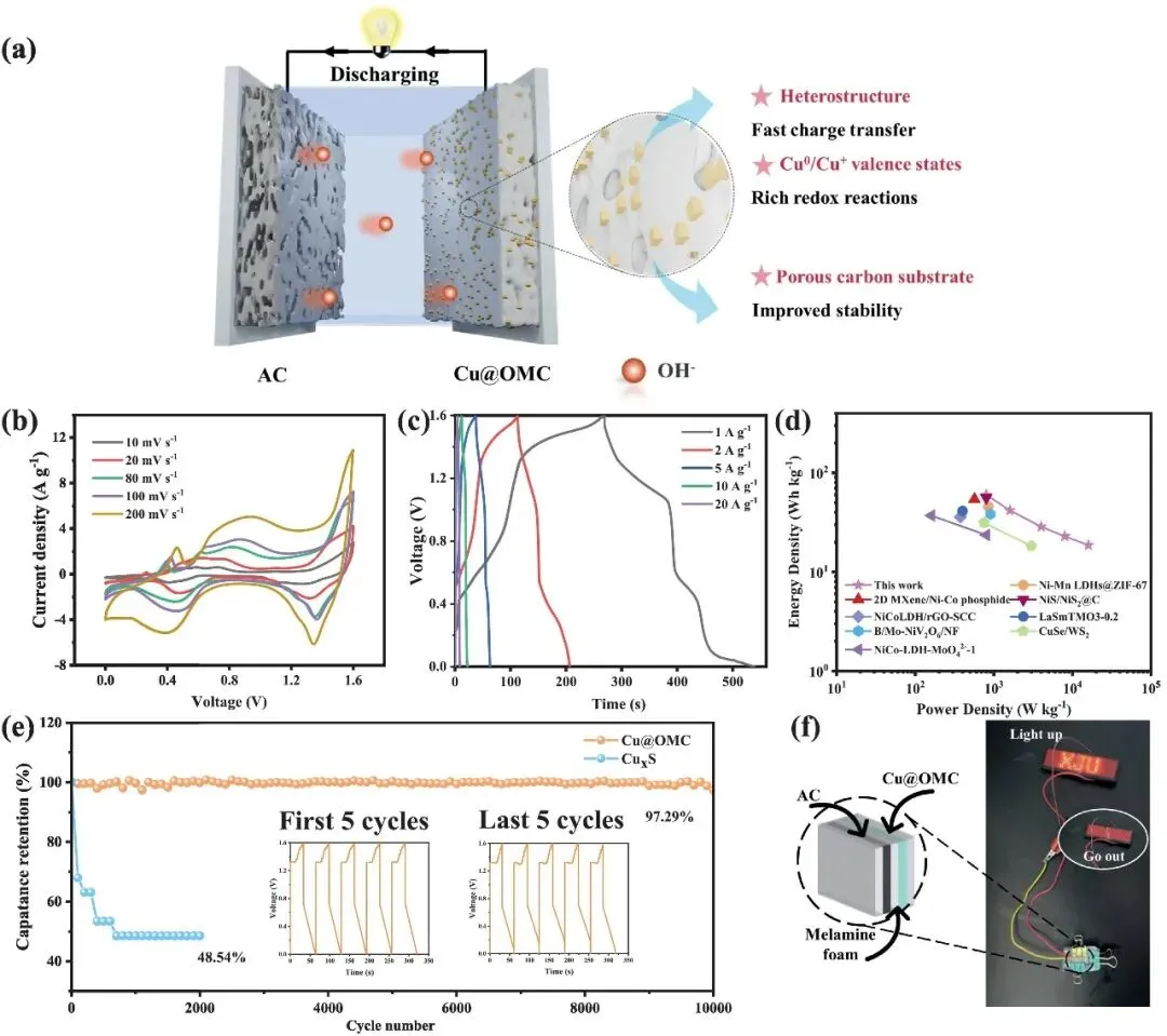 以Cu@OMC为负极、活性炭为正极组装的器件在0–1.6 V电压窗口下表现出良好的倍率性能与循环稳定性。在1 A g⁻¹下比电容为167.50 F g⁻¹,能量密度达60.01 Wh kg⁻¹(功率密度800 W kg⁻¹),循环10,000次后容量保持率达97.29%,显著优于无碳负载的CuₓS电极。器件可点亮LED灯,展示其实际应用潜力。
