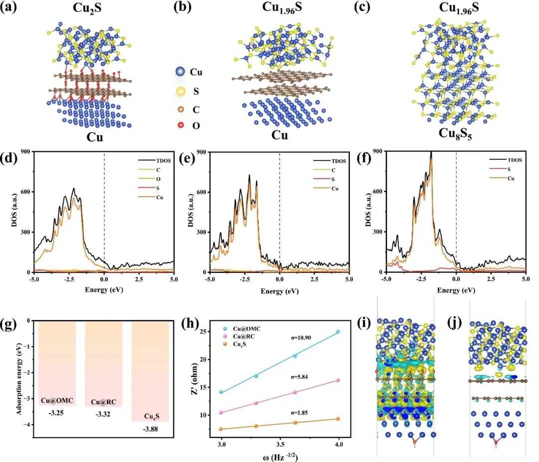 通过构建Cu₂S/富氧碳/Cu、Cu₁.₉₆S/碳/Cu及CuₓS三种模型进行理论计算,发现富氧碳基底与铜物种之间存在强电子相互作用,导致界面处电荷重分布。Cu@OMC的态密度在费米能级附近最高,表明其导电性最优;OH⁻吸附能最低(‑3.25 eV),反映其更快的离子吸附/脱附动力学。电荷密度差分图进一步证实富氧碳促进了电子从Cu₂S向Cu的迁移,优化了界面电子结构。
