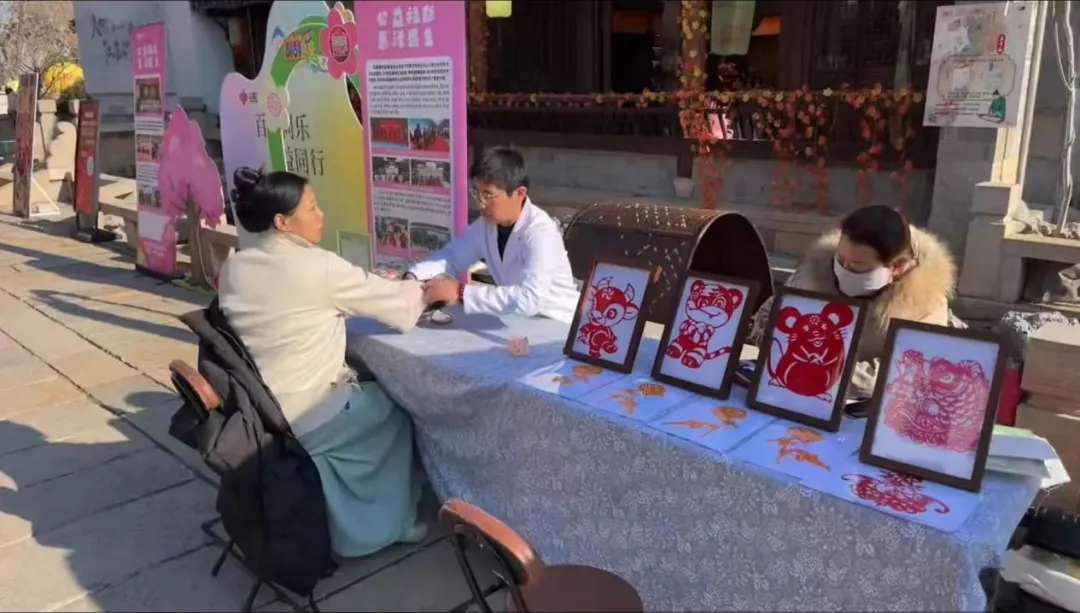 活动现场,非遗传承人现场展示非遗剪纸、剪影等传统技艺,市民游客可以亲身体验非遗创作乐趣;中医专家团队提供免费血压测量、中医把脉与健康咨询,传递科学养生理念。公益演出板块,乐器演奏引来游客纷纷驻足观看。同时,公益展板以图文形式呈现福彩公益金支持的养老院、福彩小学、社区助老等项目成果,让市民直观感知“每注彩票都是爱”的公益力量。