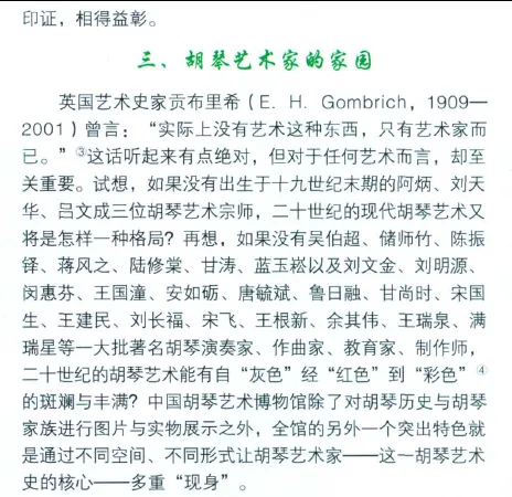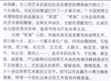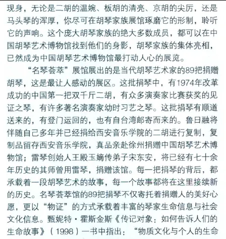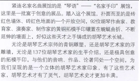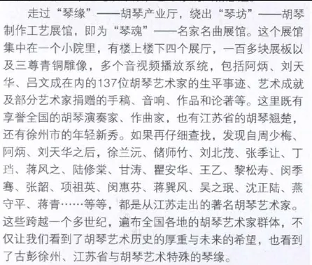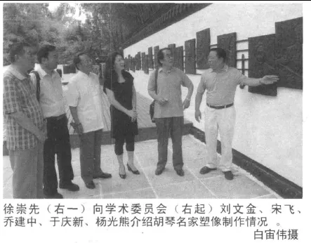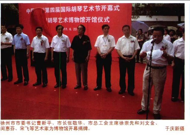 黄虎文章还说:2011年6月23日,江苏省徐州市委市政府策划、市总工会主席徐崇先牵头执行,在中国音乐家协会二胡学会以及由刘文金、乔建中、闵惠芬、宋飞、杨光熊、于庆新、朱昌耀等组成的学术委员会的指导与支持下,历时15个月,建成“中国胡琴艺术博物馆”,并于“中国·徐州第四届国际胡琴艺术节”开幕式当天开馆是日,徐州市委书记曹新平、市长张敬华等政界要员和闵惠芬、刘文金、宋飞等著名艺术家共同为博物馆揭牌,来自中国内地、香港、台湾以及新加坡、马来西亚、日本、澳大利亚、加拿大的二百多位胡琴艺术演奏家、作曲家、音乐学家、胡琴制作师和千余位徐州的胡琴爱好者,见证了胡琴艺术发展史上的这一重要时刻。