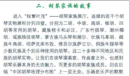 接着就整体进行介绍:中国胡琴艺术博物馆共包括“琴声悠远”—胡琴的历史发展馆,“枝繁叶茂”—胡琴家族展馆,“盛世佳音”—中国徐州国际胡琴艺术节、胡琴艺术大事记展馆,“名家名曲”—著名胡琴艺术家、经典曲目展馆,胡琴名家手印展区,“琴韵丹青”—名家书画与胡琴艺术展馆,“雅乐撷珍”—文献资料馆,“妙手精工”—胡琴制作工艺展馆,以及胡琴音乐广场、胡琴产业厅等十余个专题展区这些展区呈现为“琴渊”、“琴源”、“琴苑”、“琴缘”、“琴坊”、“琴魂”、“琴语”、“琴轩”、“琴坛”、“琴典”、“琴廊”、“琴岛”、“琴亭”、“琴碑”、“琴心”共十五个彼此相连、各具建筑特色的胡琴艺术空间,这些空间融入亭、园、院、榭、台、轩、阁、池等园林山水之中,琴器琴声琴典琴人,一体多相,唇齿相依,琴山琴水琴岛琴亭,错落有致,相映成趣。
