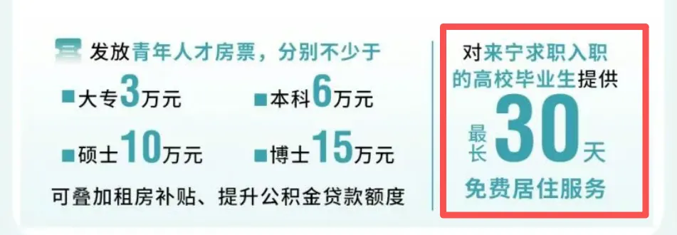 对来宁求职入职的高校毕业生,提供最长30天的免费居住服务。