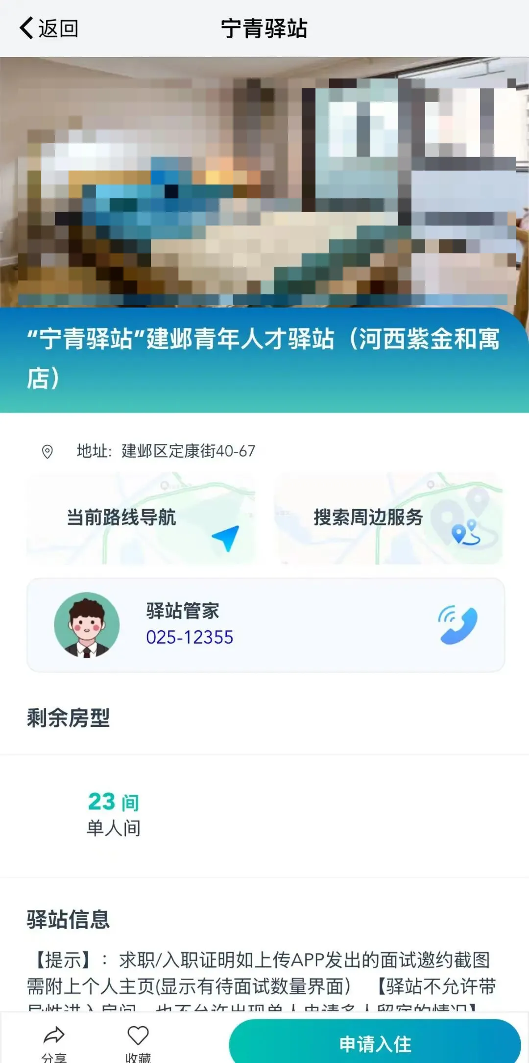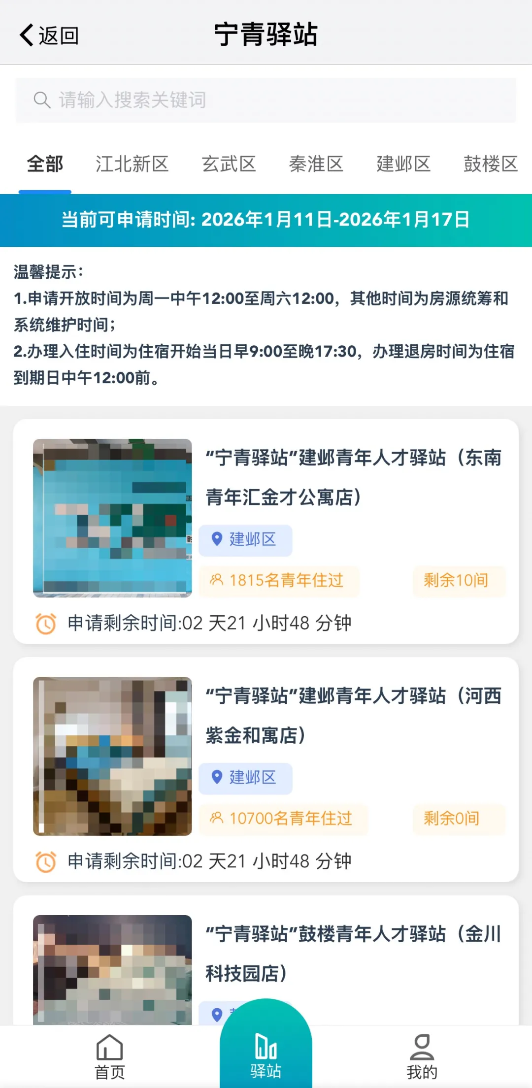 进入我的南京-宁青驿站专栏,点击驿站,即可查看可以申请的驿站。
