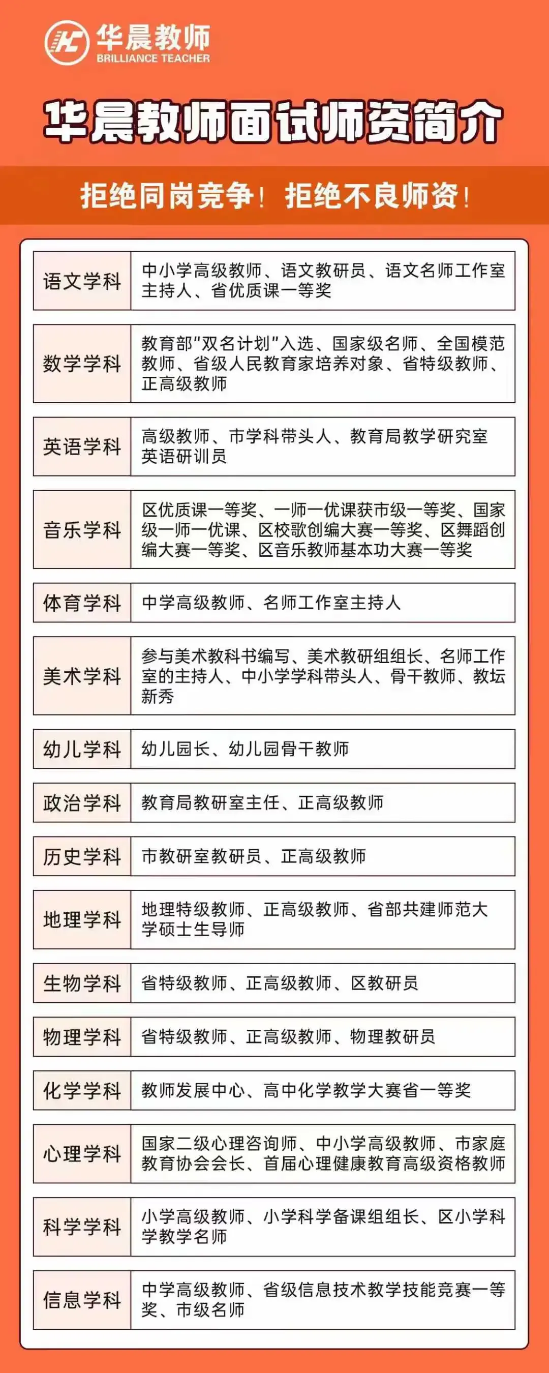 开课学科:语文、数学、英语、音乐、体育、美术、幼儿、政治、历史、地理、科学、信息、心理、物理、化学、生物